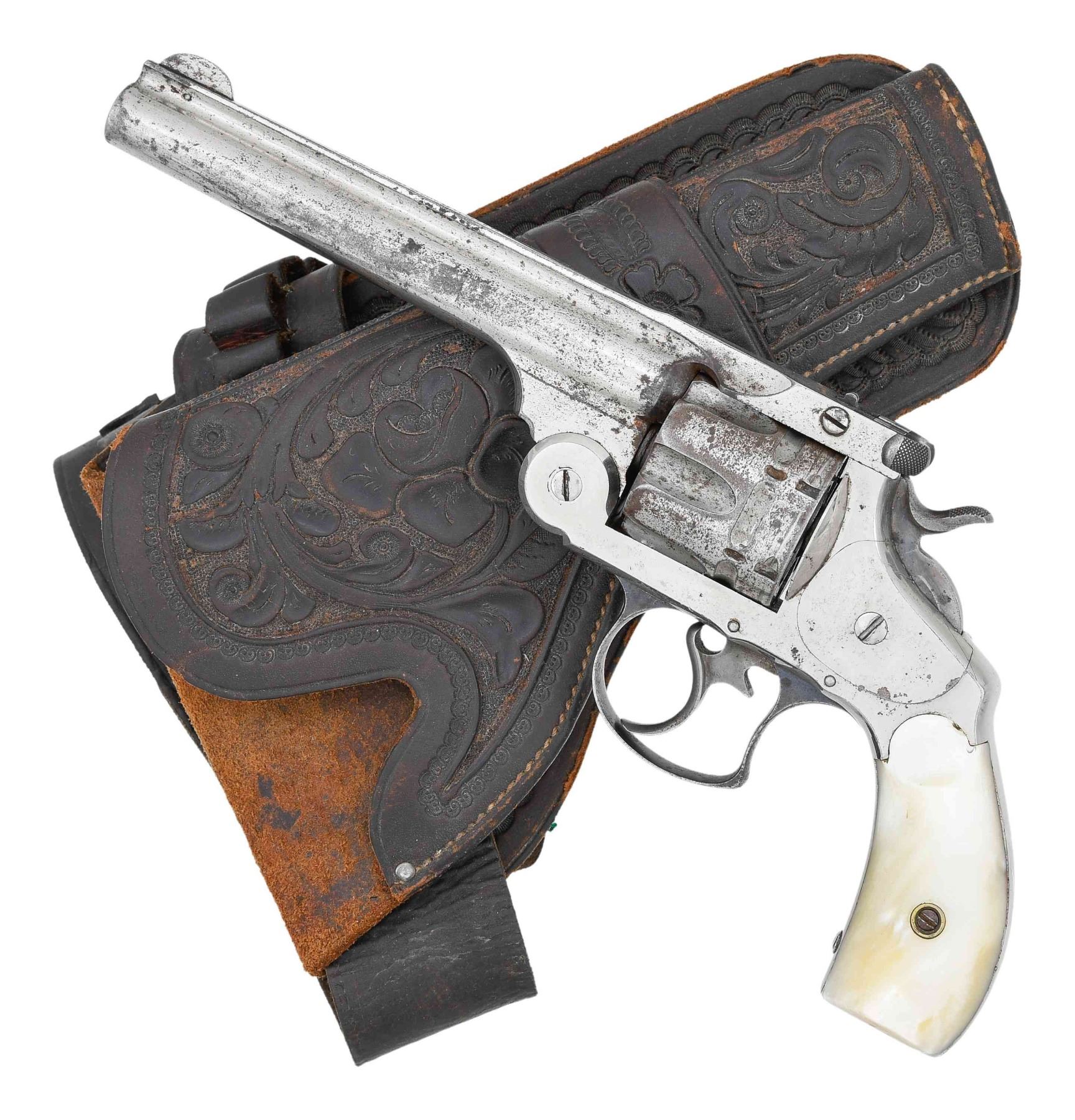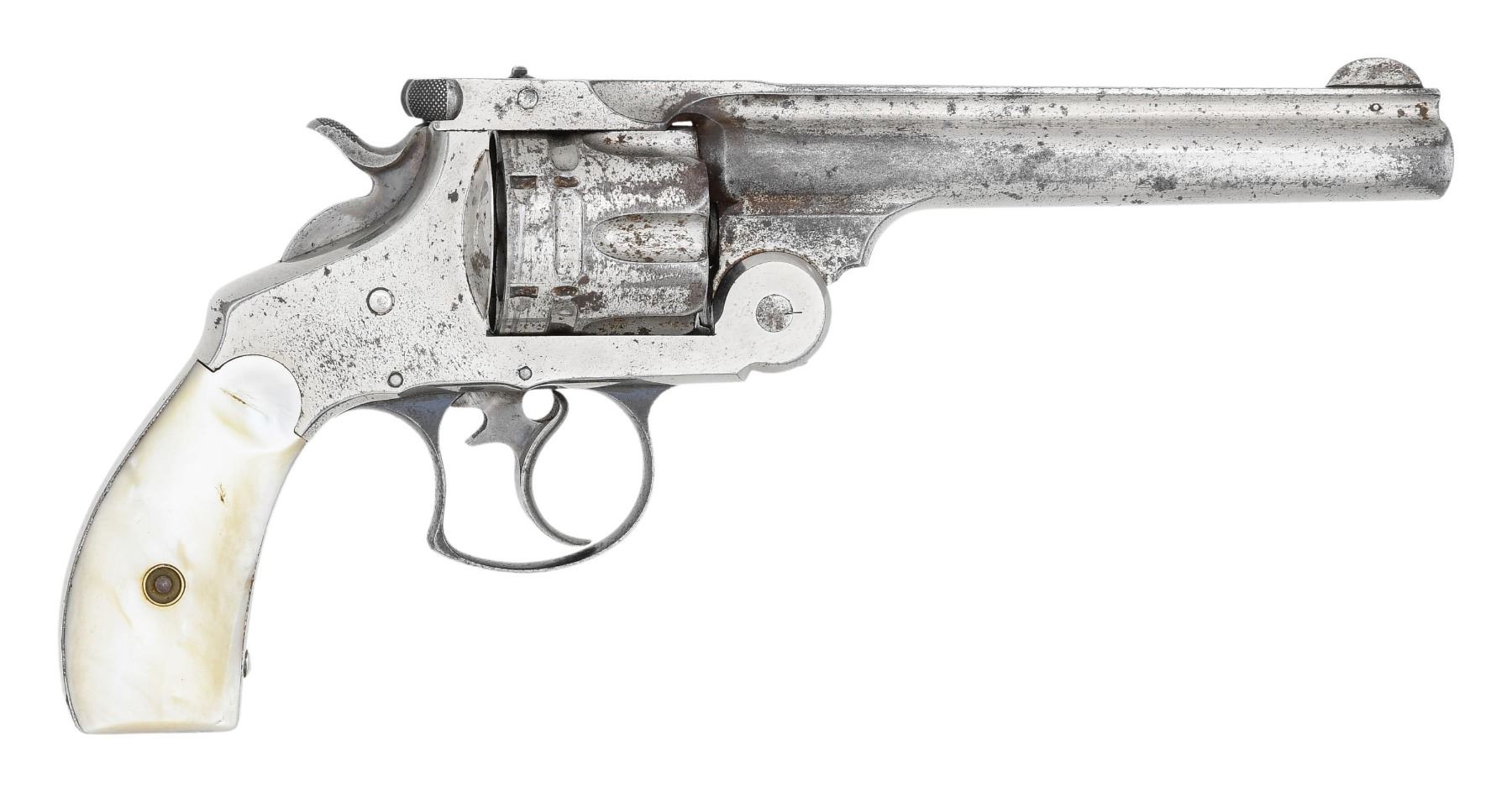 REVOLVER. Cal. 44-40. S# 5994. Bbl. 6" with full rib. Pinned blade semi-circular front sight with fixed rear sight. 6-shot fluted rocker type cyl. was cut with a double set of stop notches having free grooves between the forward notches. Top break action. Nickel finish with case colored trigger and hammer with knurled thumb piece. Blue finished trigger guard. 2-piece rnd. butt pearl grips. 54,668 mfg. 1881-1913. UNATTACHED ACCESSORIES: unmarked hand tooled single loop leather holster with unmarked leather cartridge belt with nickel finished buckle. CONDITION: revolver retains over 50% nickel finish showing spotted finish loss and light corrosion. Hammer and trigger retain lightly visible case colors in protected areas. Trigger guard has traces of original blue showing surface corrosion. Left grip panel shows small chips at action and heel. Action is tight and functions properly in SA and DA modes. Mildly to moderately pitted bore retains strong rifling. Holster is in very good condition showing mild scuffs and retaining hand tooling. Belt has dark worn appearance with some light wrinkling overall. (01-26281/DS). ANTIQUE. $1,000-1,500.