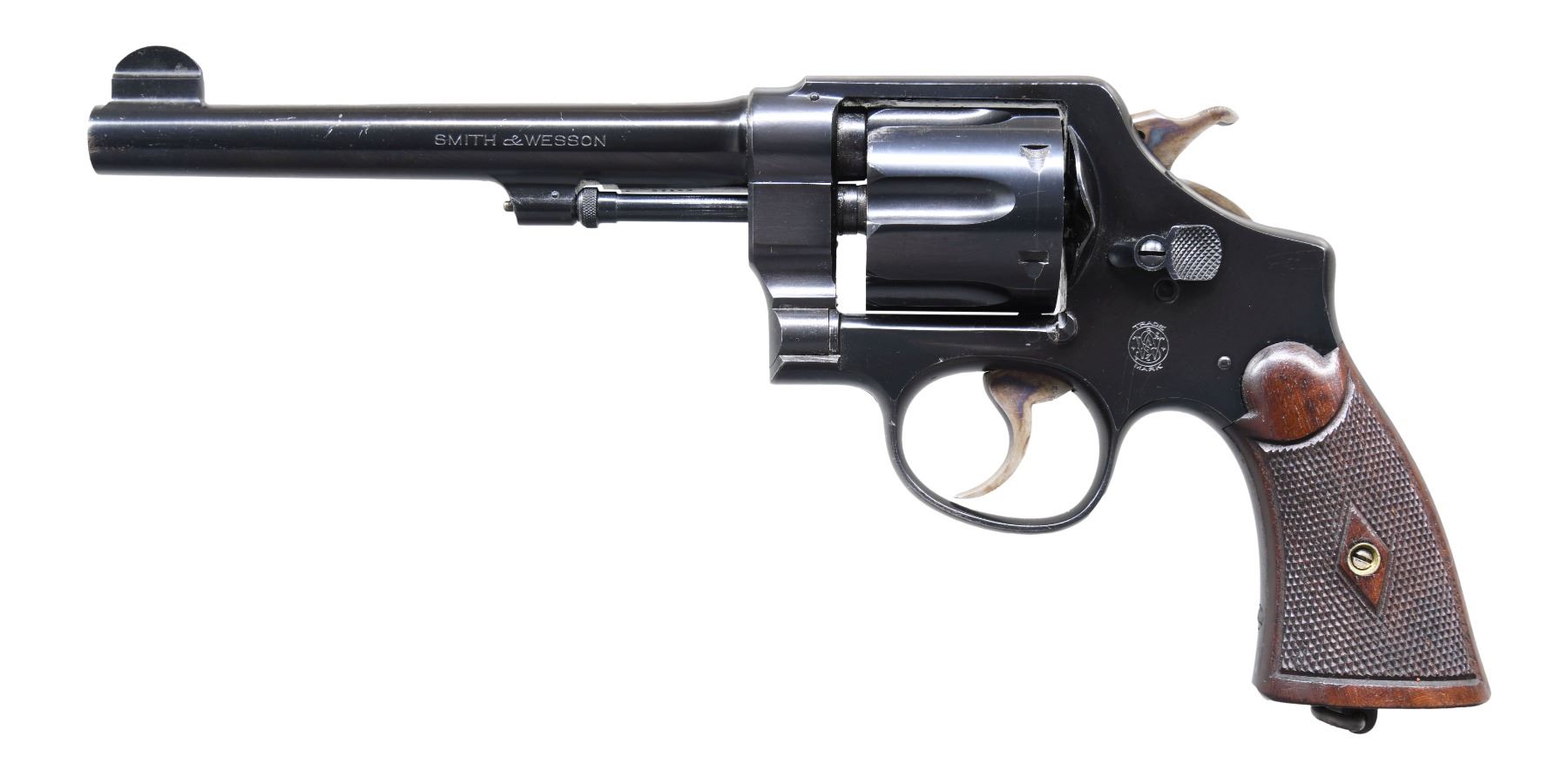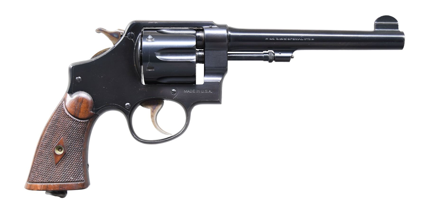Cal. 44 S&W. S# 25142. Bbl. 6 1/2" pinned. Round blade front sight. Fixed rear sight. Matching numbers on frame, bbl., cyl. & extractor. 2nd Model 44 Hand Ejector made using older military M1917 frame. Crane cutout has Springfield Armory eagle inspection stamp. Blued finish with case colored hammer & trigger. Unnumbered checkered diamond center grips. Lanyard ring present on bottom of grip frame. CONDITION: grips show a few dings & scattered handling marks. Trigger & hammer retain most of their case colors with some operational wear & light oxidation. Balance of metal retains 95% blue with notable patches of oxidation under grips, scattered edge & operational wear. Action functions properly when hand cycled. Good bright bore with some light oxidation spots. PROVENANCE: From the Lifelong Collection of George Staden S&W Member #3451. (25-67/MJC). CURIO. $1200-1800.