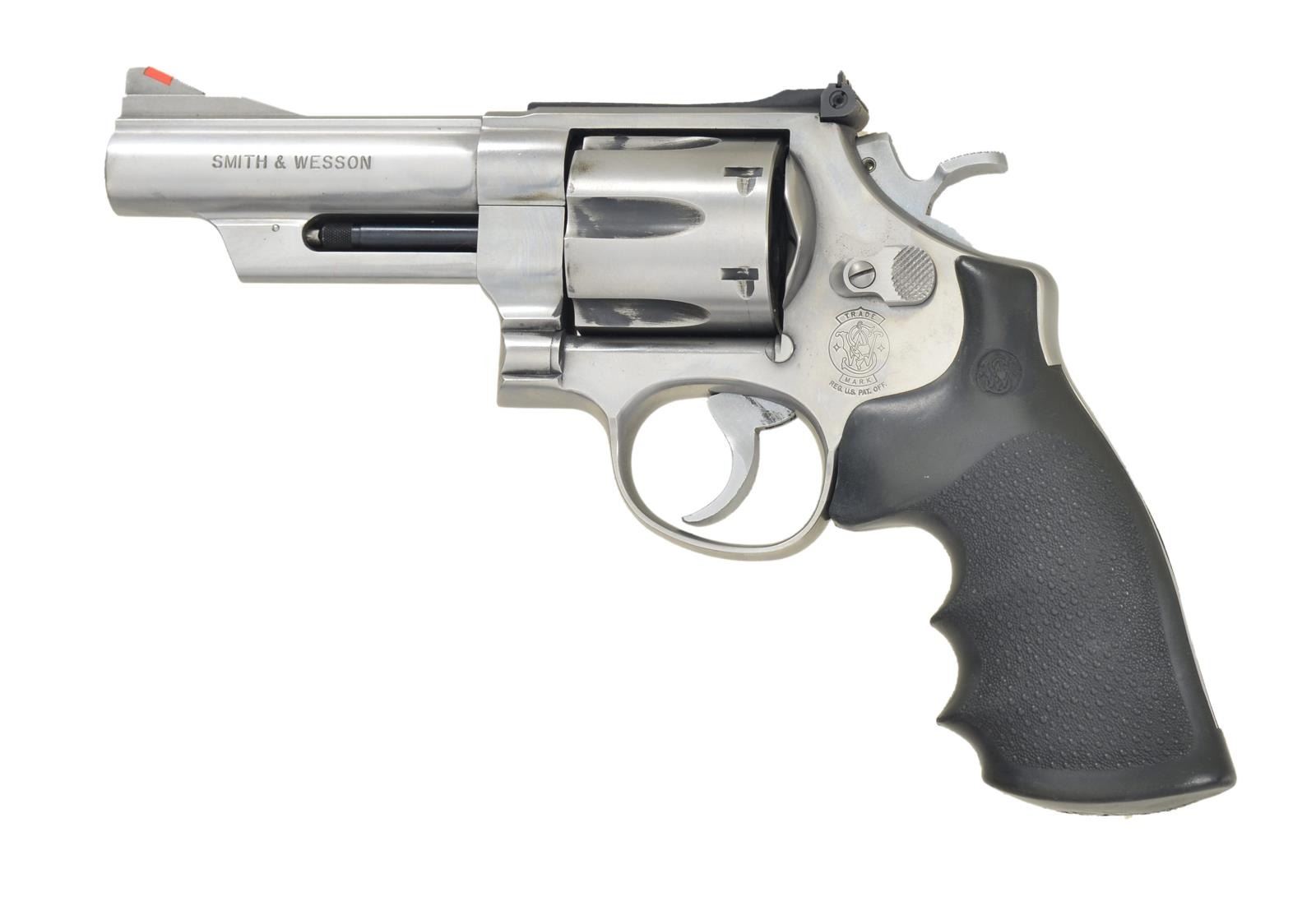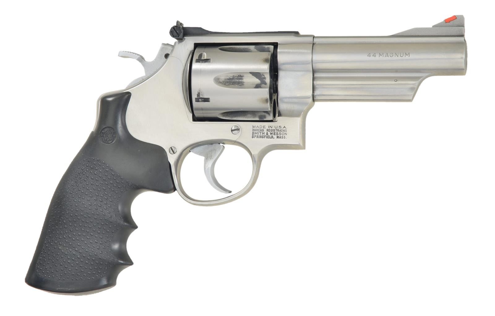 Cal. 44 Magnum. S# BPR9879. Bbl. 4". Stainless Steel Model 629-1 traditional double action revolver. Serrated top bbl. strap. Red insert ramp front sight w/ adj. rear. 6 Shot fluted cyl. Serrated front & backstrap. Checkered hammer spur & cyl. release. Black rubber Pachmayer textured grips w/ S&W logo at top. UNATTACHED ACCESSORIES: leather pistol rug w/ red lining. CONDITION: stainless steel is a bit stained from use. Light drag line on cyl. Bright bore w/ sharp rifling. Timing appears fine in double action but a bit close in single. (22-3164/JZ). MODERN. $300-500.