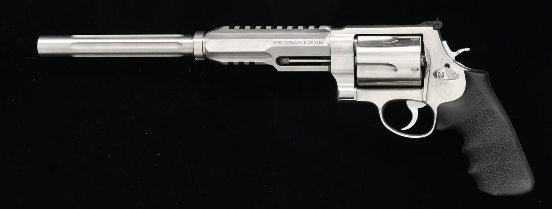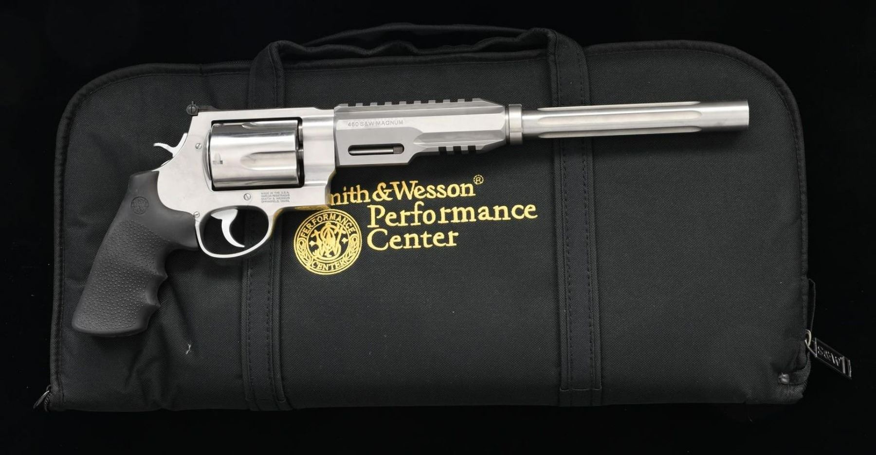 Cal. 460 S&W Mag. S# CTR7762. Bbl. 12" fluted. No front sight. Adjustable rear sight. Picatinny rail present on top & bottom of bbl. Performance Center revolver. Stainless finish. Black rubber finger groove grips w/ S&W logo. UNATTACHED ACCESSORIES: matching numbered white box w/ factory softcase, detachable front sight, cable lock, factory fired case, manual, paperwork, Butler Creek Ultra sling & spare sling hardware. CONDITION: all aspects near excellent. PROVENANCE: The Collection of Gun Sport Ltd owned by Jon R. Thomas. (23-3997/MJC). MODERN. $1000-1500.