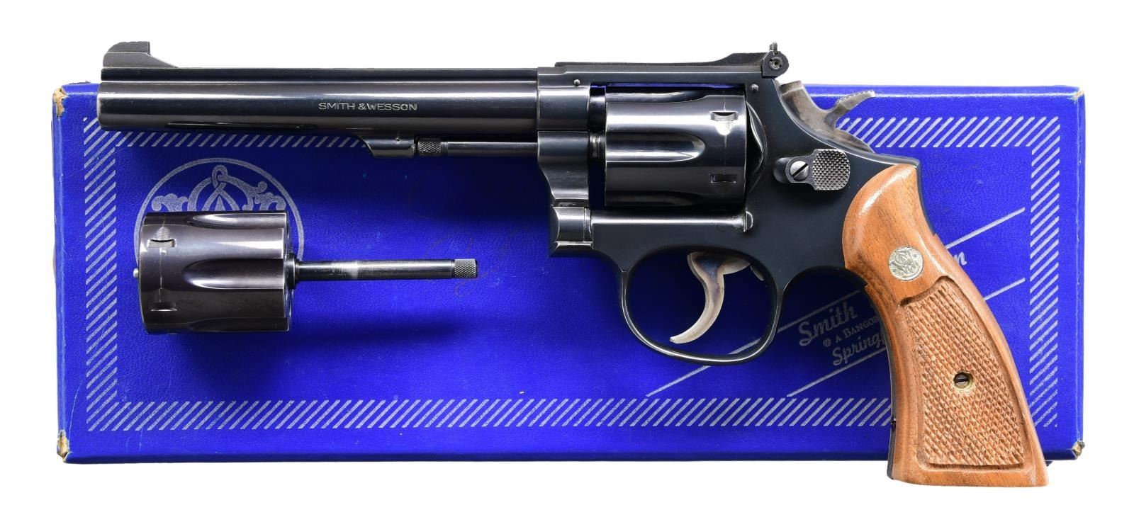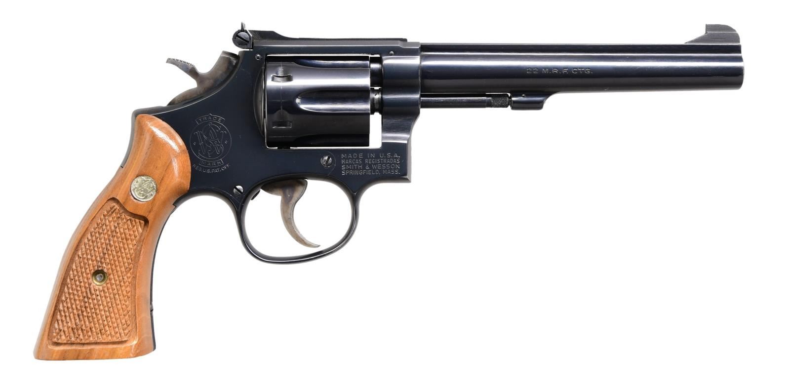 Cal. 22 Mag. S# 92K8927. Bbl. 6" pinned. Patridge front sight. Adjustable square notch rear sight. Mfg. 1977-82. Blued finish w/ case colored trigger & hammer. Checkered walnut grips w/ stamped matching number on right panel & silver S&W medallions. UNATTACHED ACCESSORIES: matching numbered factory box w/ 22 LR. cyl, cleaning kit, screwdriver & manual. CONDITION: grips show a couple minor handling marks. Trigger & hammer retain most of their case colors showing some light operational wear. Balance of metal retains 98% original blue w/ light edge wear at muzzle & a drag line on cyl. Action is functional when hand cycled. Bright near excellent bore. (24-2108/MJC). MODERN. $1500-2000.