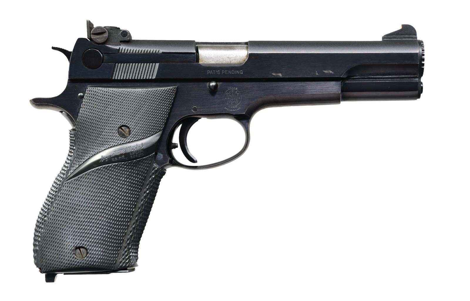 Cal. 38 Spl. S# 102244. Bbl. 5". Patridge front sight w/ added white paint. Adjustable square notch rear sight. Mfg. 1963-70. Target pistol chambered for 38 Spl. wadcutter. Blued finish. Pachmayr Signature grips. MAGS: 2-5 rd. UNATTACHED ACCESSORIES: red velvet lined presentation case w/ top lid beginning to separate, original checkered S&W grips & tool. CONDITION: grips show light handling wear. Metal retains 95% original blue w/ some edge & handling wear most notable on tang. Very good plus bright bore. (24-1593/MJC). CURIO. $800-1200.