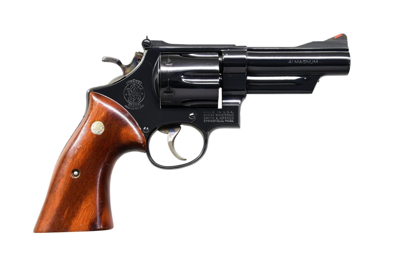Cal. 41 Mag. S# N145034. Bbl. 4" pinned. Serrated ramped blade front sight w/ orange insert. Adjustable white outline square notch rear sight. Mfg. 1973. Blued finish w/ case colored target trigger & hammer. Unnumbered smooth target grips w/ silver S&W medallions. UNATTACHED ACCESSORIES: presentation case w/ screw driver, cleaning rod & bore brush. CONDITION: grips show some light scratches & handling marks. Trigger & hammer retain nearly all their case colors w/ some light operational wear. Balance of metal retains 98% original blue w/ some light oxidation specks on cyl., light muzzle wear & a few minor handling marks. Action is functional when hand cycled. Very good plus bright bore. (24-2101/MJC). CURIO. $1300-1800.