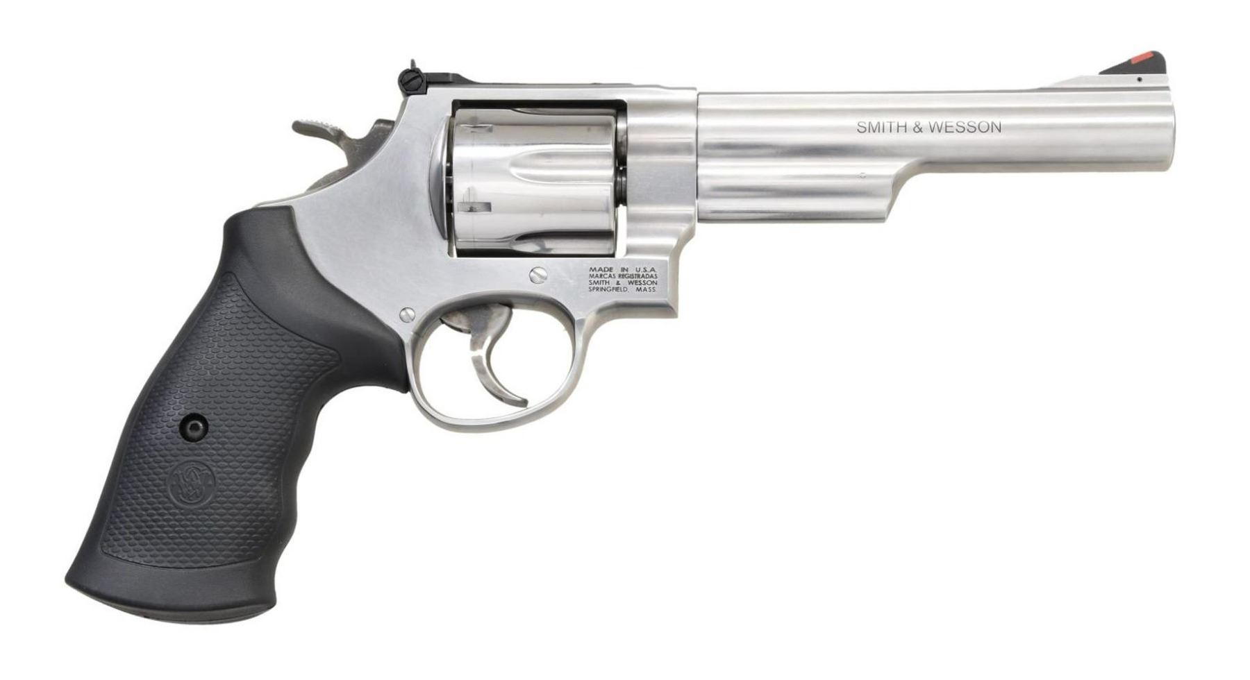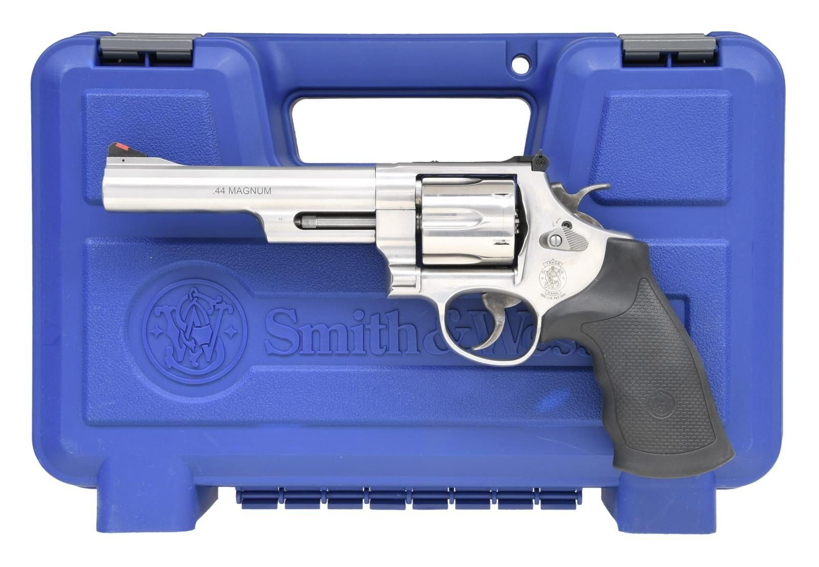 Cal. 44 Mag. S# DRR3594. Bbl. 6" w/ half underlug. Ramped serrated blade front sight w/ orange insert. White outline adjustable rear sight. Stainless finish w/ case colored trigger & hammer. Black rubber grips w/ S&W logo. UNATTACHED ACCESSORIES: matching numbered factory hardcase w/ cable lock, internal lock key & manual. CONDITION: all aspects near excellent. PROVENANCE: The Collection of Gun Sport Ltd owned by Jon R. Thomas. (23-3856/MJC). MODERN. $500-800.