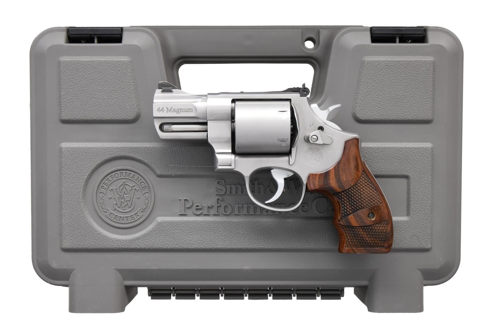 DA REVOLVER. Cal. 44 Magnum. S# CRN7602. Bbl. 2 1/2" fluted w/ rib & fully shrouded ejector. Orange ramp blade front sight w/ white outline, square notch adj. rear sight. Six shot round cyl. 3 screw N frame action has internal key lock. Satin stainless finish. .400" Semi-target hammer w/ .312 smooth target trigger. 2 Piece Goncalo Alves checkered finger groove grips. UNATTACHED ACCESSORIES: Gray molded box with matching label. Box contains instructions, registration card, safety lock keys, fire cartridge & trigger lock. CONDITION: metal finish shows small spots & cyl. drag line. Very good grips. Bright near excellent bore. (23-4985/DS). MODERN. $1,200-1,800.