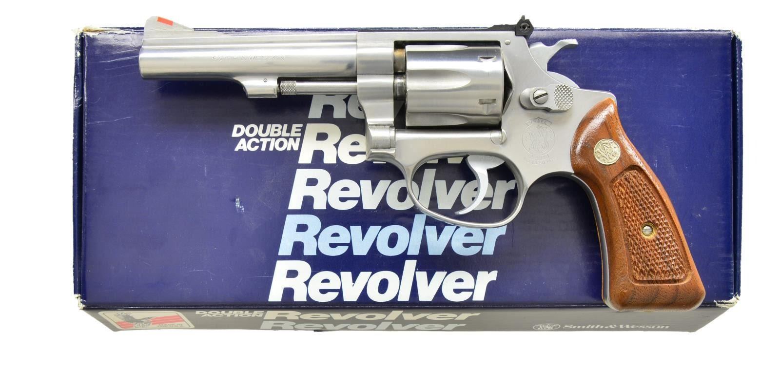 Cal. 22 LR. S# AYF8037. Bbl. 4". Stainless steel J Frame with fixed serrated ramp front sight with orange insert and adjustable rear sight. Wide checkered spur hammer and smooth wide trigger. Grips are factory checkered with S&W monogram. UNATTACHED ACCESSORIES: factory cardboard box serial numbered to the revolver with manual, cleaning rod, mop, brush and tool. CONDITION: metal shows fine to light operational marks and a faint dragline on the cylinder. Grips show light use and still retain sharp checkering. Bore is very good, bright and strongly rifled. (22-4406/CW). MODERN. $400-600.