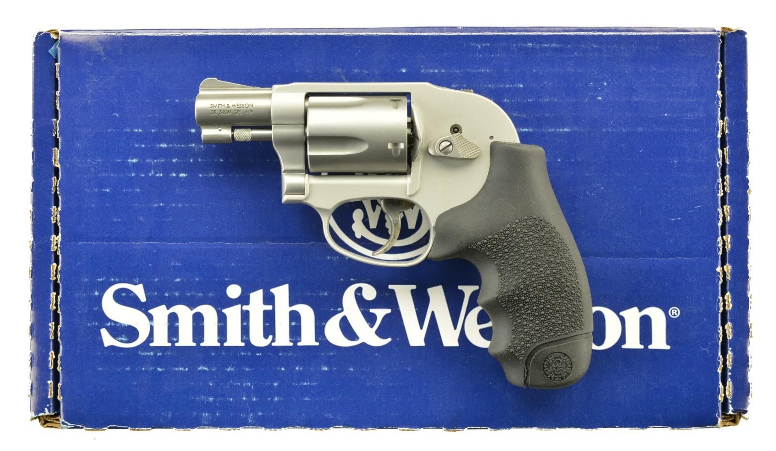 Cal.38 Spl. S# CZP2972 Bbl.2". Airweight J Magnum frame, rated for 38 Spl +P. A very light, very compact, traditional double action revolver. This latest version, w/ internal key lock was introduced in 2002 as the Model 683-3. Stainless steel fluted 5-shot cylinder & barrel. Silver ramp front sight & fixed square notch rear sight. Checkered hammer spur is accessible over shrowded hammer. Hogue rubber monogrip. Barrel marked "SMITH & WESSON / .38 S&W SPL. +P" on left. The marking "AIRWEIGHT" is laser etched on right sideplate. UNATTACHED ACCESSORIES: Blue numbered, factory box & paperwork. Spare S&W branded boot grips. CONDITION: Very little outward sign of use. No staining in areas where it is common, such as front of cylinder. Only faint drag line on outside of cylinder & where ejector touches frame, inside. Bright bore w/ sharp rifling. (22-2671/JZ). MODERN. $350-550