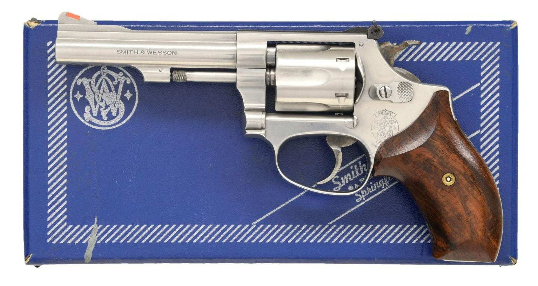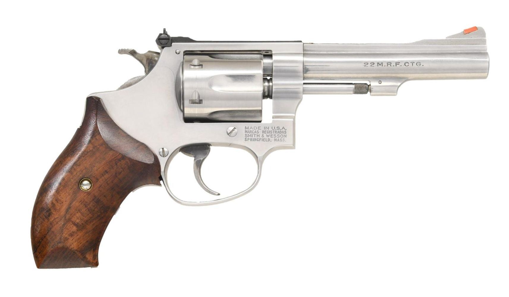 Cal. 22 Mag. S# BUD8738. Bbl. 4". Serrated ramped blade front sight w/ red insert. Adjustable rear sight. Mfg. 1988-97. Stainless finish. Case colored trigger & hammer. Replacement smooth hardwood grips. UNATTACHED ACCESSSORIES: mismatched replacement S&W box w/ paperwork. CONDITION: very good plus overall w/ some light handling & operational wear. PROVENANCE: The Collection of Gun Sport Ltd owned by Jon R. Thomas. (23-3941/MJC). MODERN. $700-1000.