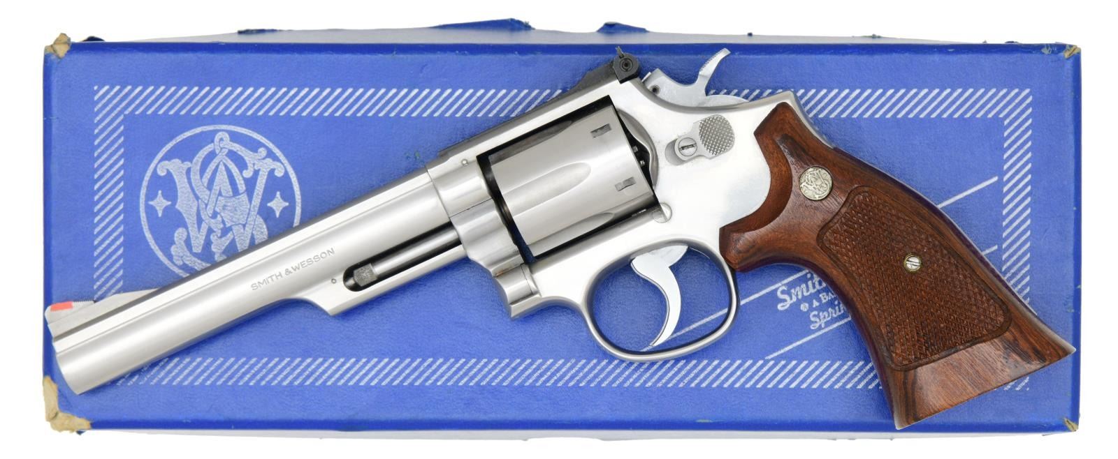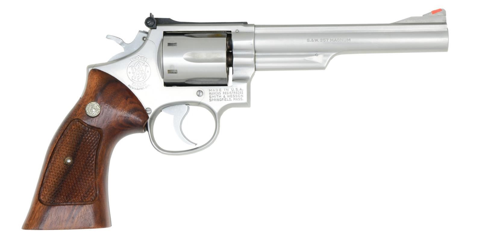 Cal. 357 Mag. S#69K5901. Bbl. 6" pinned. Ramped blade front sight w/ orange insert. Square notch adjustable rear sight. Stainless finish. Checkered walnut target grips w/ silver S&W medallions. UNATTACHED ACCESSORIES: matching numbered factory box w/ screwdriver, cleaning rod & paperwork. CONDITION: grips show a couple handling marks. Metal shows a few light scratches & handling marks. Very good plus bright bore. (24-767/MJC). MODERN. $700-1000.