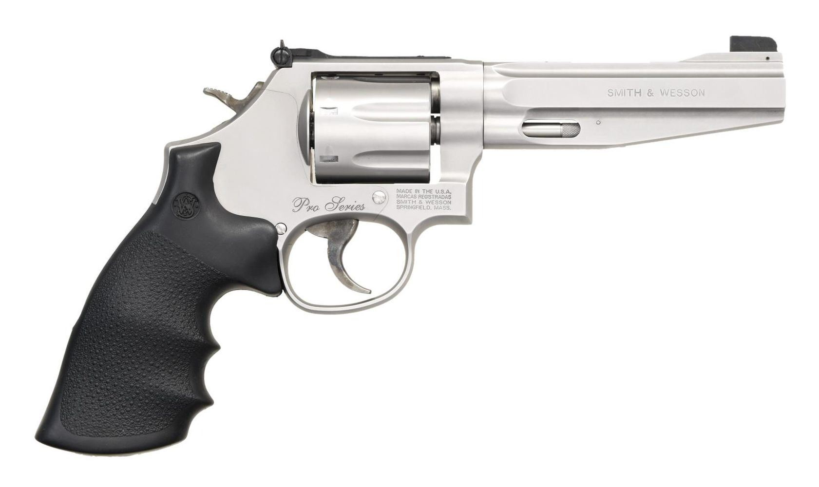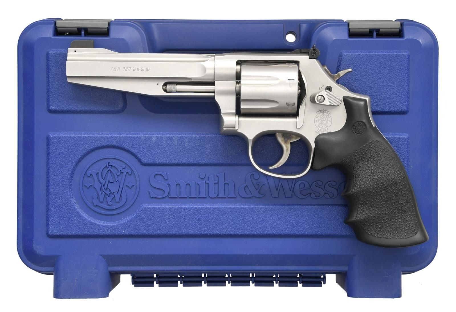 DA REVOLVER. Cal. 357 Mag. S# CUA8893. Bbl. 5". Blade front sight. Adjustable rear sight. Plus model w/ 7 shot cyl. Stainless finish. Hogue Monogrip w/ S&W factory logo. UNATTACHED ACCESSORIES: w/box. CONDITION: all aspects near excellent. PROVENANCE: The Collection of Gun Sport Ltd owned by Jon R. Thomas. (23-4087/MJC). MODERN. $700-1000.