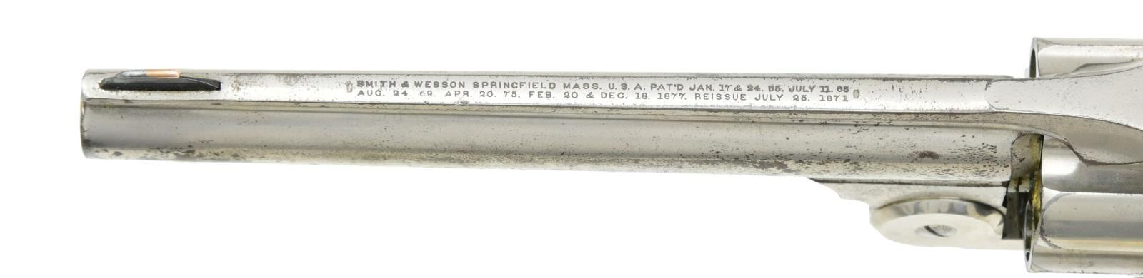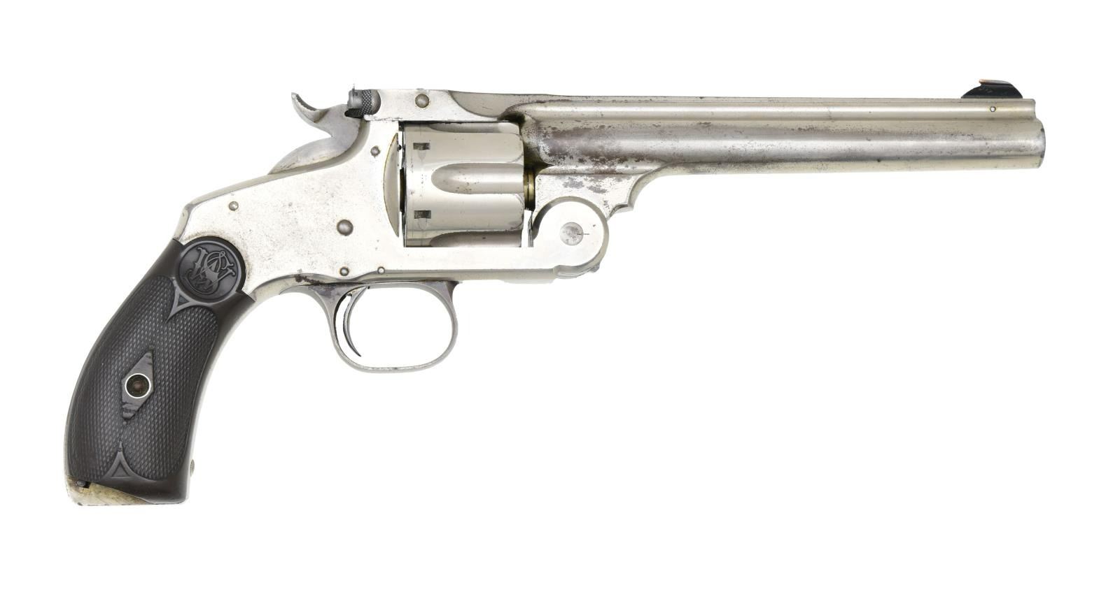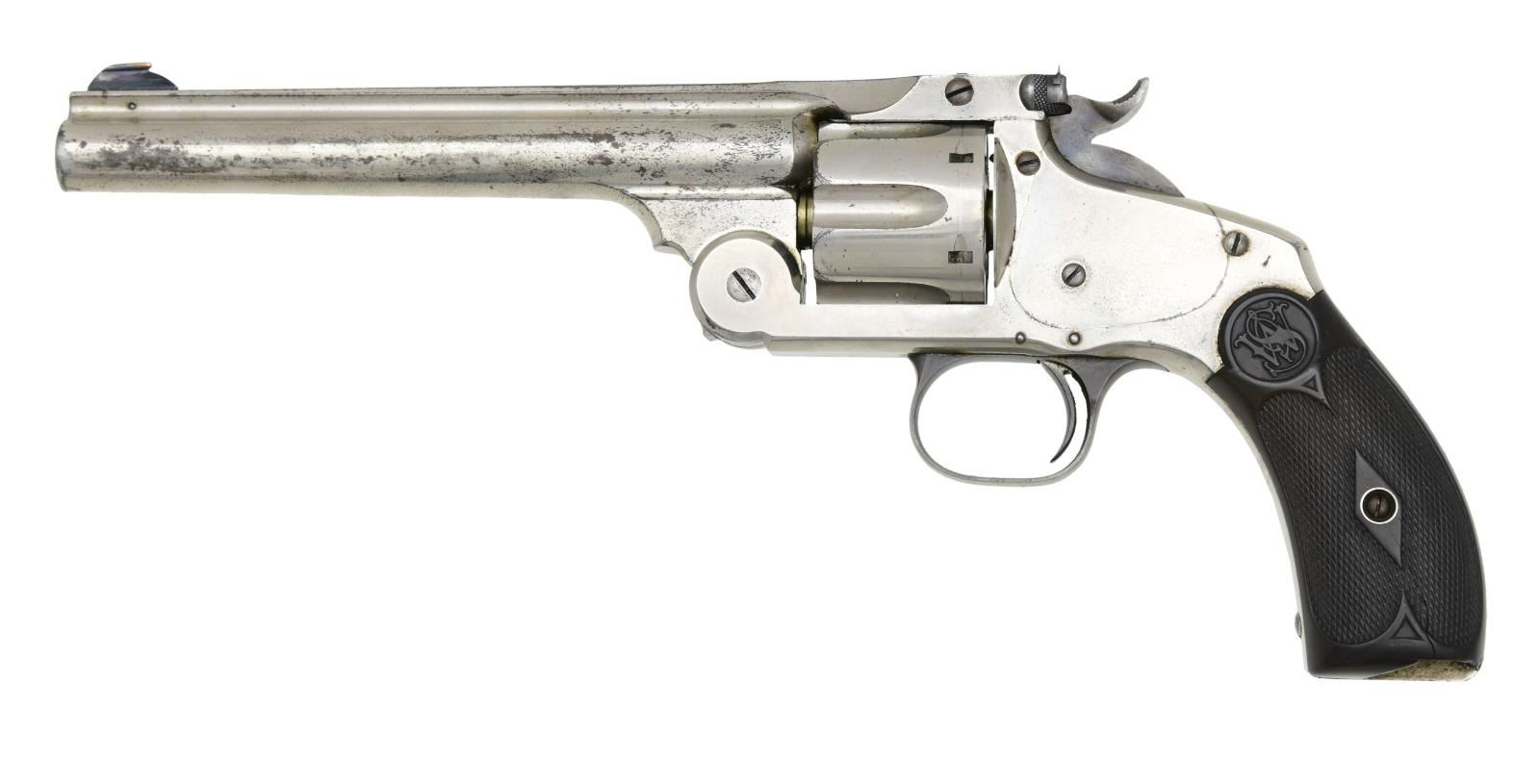 Cal. 44 S&W. S# 20691. Bbl. 6 1/2". Ramped brass bead front sight. U-notch rear sight. Second model American No. 3 revolver. Matching numbers on cyl. & frame. Nickel finish w/ case colored hammer & trigger. Checkered hard rubber grips w/ S&W logo & faint number on right panel that appears to match frame. CONDITION: left grip panel shows a notable crack towards bottom, both grip panels show large chips at bottom, some flattened points & dings. Hammer & trigger are mostly gray w/ traces of case colors & some oxidation. Metal retains 60% nickel w/ scattered oxidation & flaking. Good bore w/ scattered oxidation but strong rifling. (01-25269/MJC). ANTIQUE. $1200-1800.