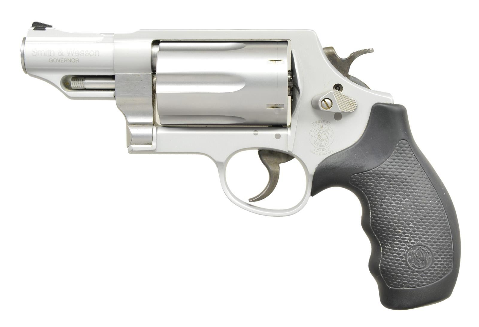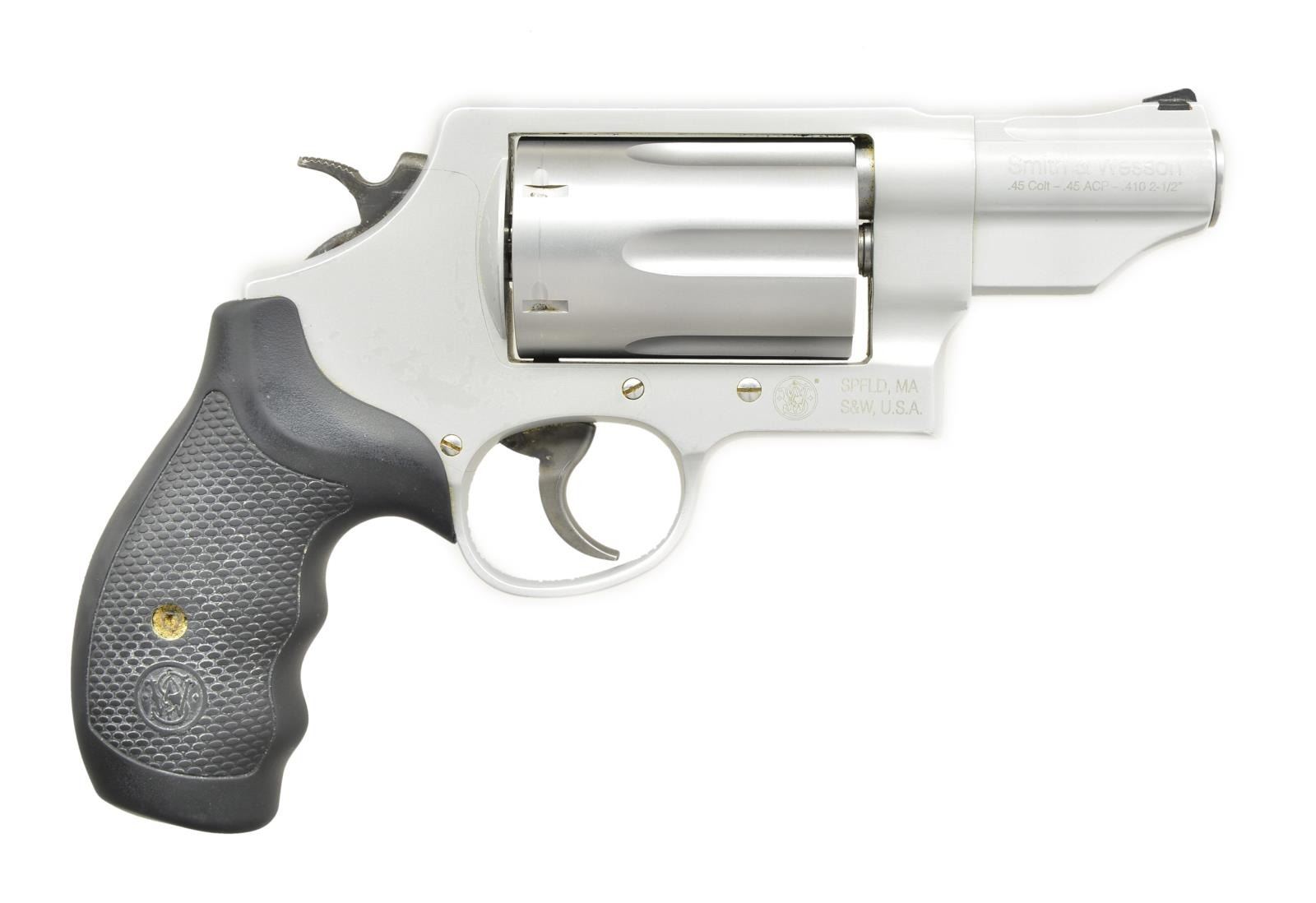 Cal. 45 Colt, 45 ACP & 410 2 1/2" Ga. S# CVU2444. Bbl. 2 3/4". Fixed sights with silver colored finish. Frame is an alloy with steel cylinder. Black factory rubber textured grips. UNATTACHED ACCESSORIES: factory cardboard box serial numbered to the revolver, lock & key, fired case, 3 moon clips, & warranty card. Bond Arms zippered soft case with DeSantis RH leather holster and cartridge pouch. CONDITION: metal surfaces show light use and a few scattered handling marks and a faint dragline on the cylinder. Grips have some ingrained dirt. Bore is very good, bright and strongly rifled. (22-3421/CW). MODERN. $400-600.