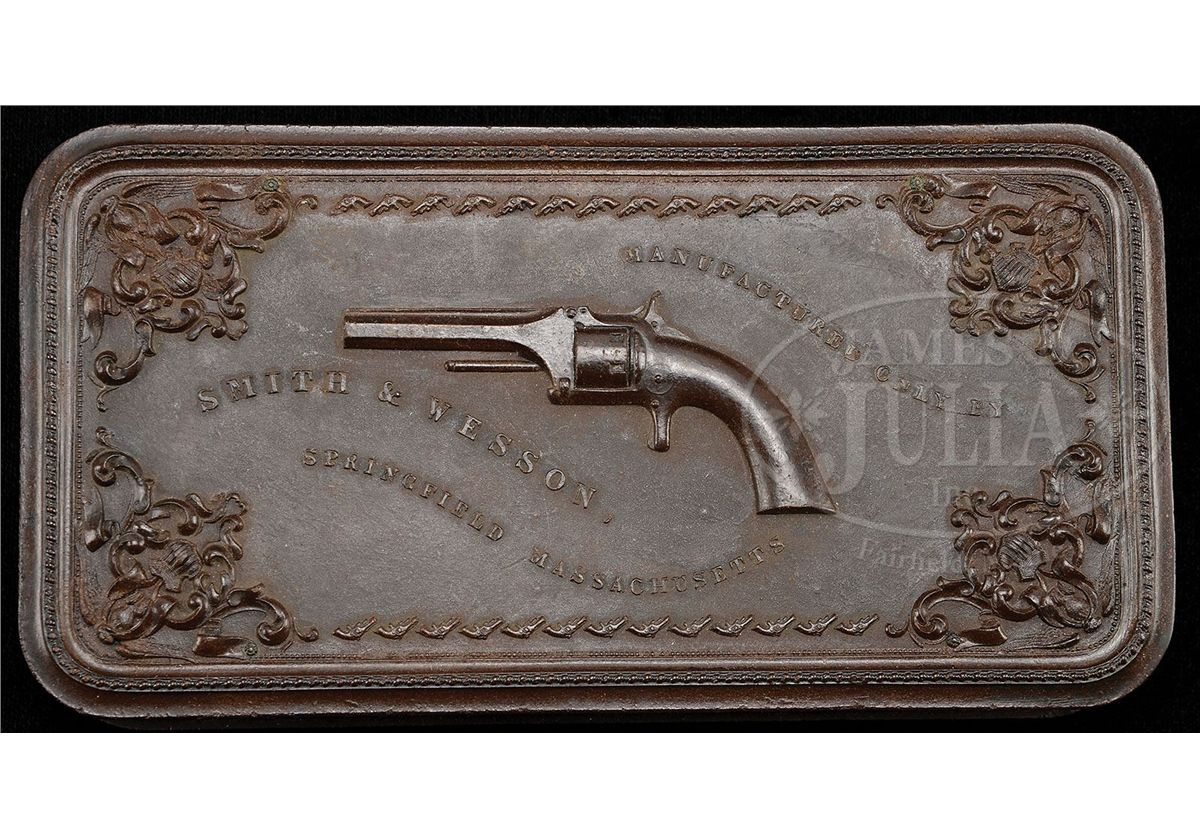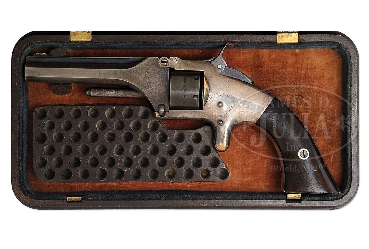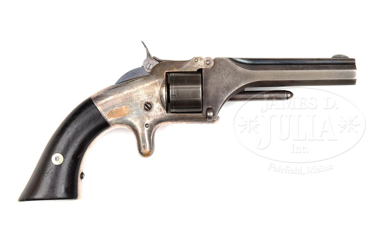 SN 10863. Cal. 22. This is a scarce Smith & Wesson Model #1 first issue revolver of the last or 6th type in fine condition in an orig Smith & Wesson embossed "Pistol" presentation case. This gun conforms to other first issue revolvers with bbl address "SMITH & WESSON, SPRINGFIELD MASS" and cylinder "PATENTED APRIL 3, 1855 & JUNE 15, 1858". The bbl and cylinder were orig bright blue and the frame silver plated. The gun has matching assembly numbers, and the SN is stamped on the inside of the grip. PROVENANCE: Marlan Polhemus Collection. CONDITION: Bbl and cylinder are smooth brown/silver overall with traces of finish in protected areas, and markings are crisp and easily discernible. Frame retains about 95% of its orig silver. Stocks retains about 1/2 of their orig varnish, though thinning. Gun is mechanically functional with good crisp rifling in bore. The accompanying case has good brown color with excellent details as can be seen in photos. There are a few small chips that do not affect aesthetics. Red velvet on bottom of case is faded and soiled where in contact with gun and there is a 1/2" chip to ear of lower gutta percha bbl mount. The green embossed velvet in top of case, very good overall, with soiling where cylinder contacts it. Hinges are a little loose and case will no longer lock shut. 4-48727 JS83