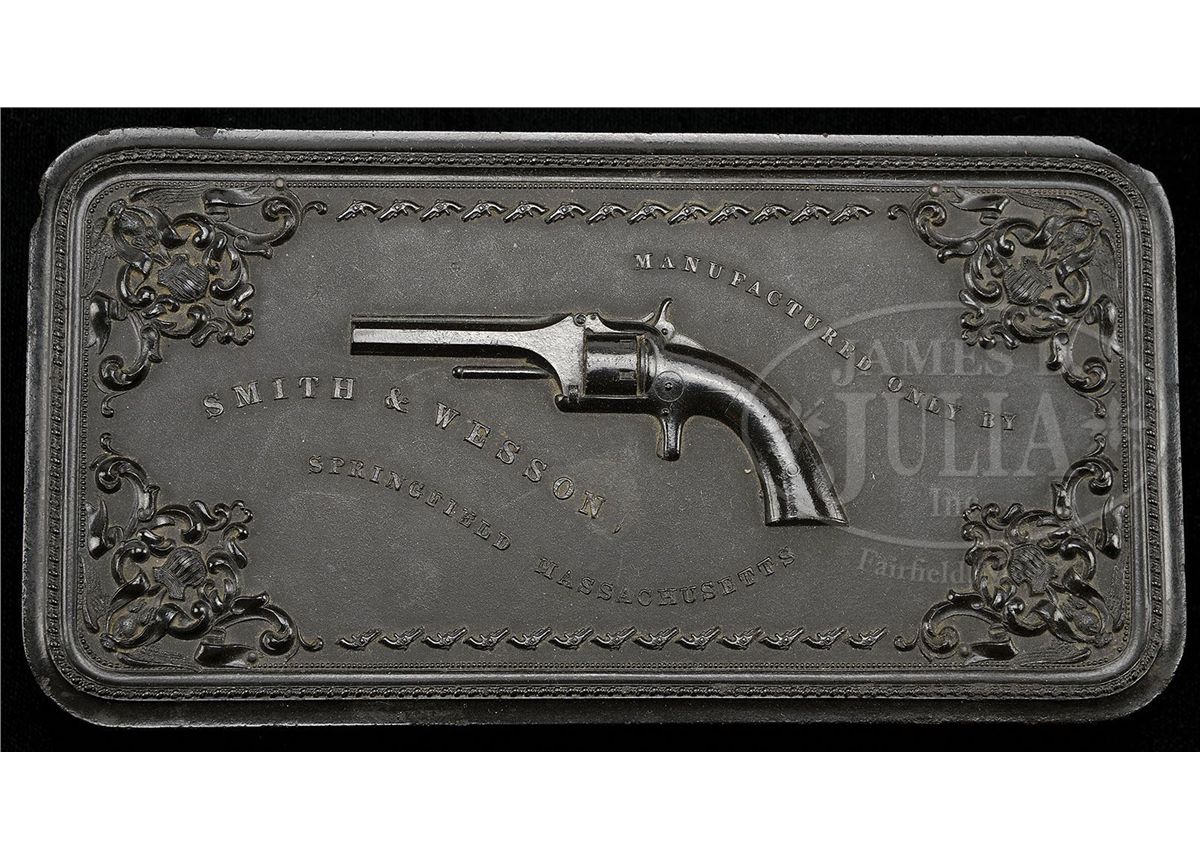 SN 28994. Cal. 22. 3/3-16" bbl, rosewood grips, blue bbl and cylinder with silver plated brass frame. This is a fine Smith & Wesson 22 cal. 2nd issue revolver that retains almost all its orig finish and appears possibly unfired that is retained in a beautiful black Smith & Wesson embossed gutta-percha "Pistol" case. This gun conforms to other second issue pistols in this series with "SMITH & WESSON SPRINGFIELD, MASS" on bbl flat and "PATENTED APRIL 3, 1855, JULY 5, 1859 & DECEMBER 18, 1860". The gun has matching assembly numbers, and the SN is stamped on the inside of the grip. PROVENANCE: Marlan Polhemus Collection. CONDITION: Bbl retains 98% of its orig bright blue finish with small thin scattered scratches. Bore is crisp and shiny, cylinder retains about 70% of its bright blue finish with balance mottled brown/plum with light pitting. Frame retains about 98% of its orig silver plate with light scratching. Hammer retains about 70% case color, though some muted with balance turning silver/gray. Rosewood stocks retain 98% of their orig varnish with only reductions from scuff on right edge on butt. Gun mechanically functions well. Associated case has good black color and excellent details with several small edge chips. Interior of case is soiled and worn. The bbl mounting bracket is missing both ears, which are broken off. Fifteen rimfire cartridges are retained in box. 4-48729 JS84