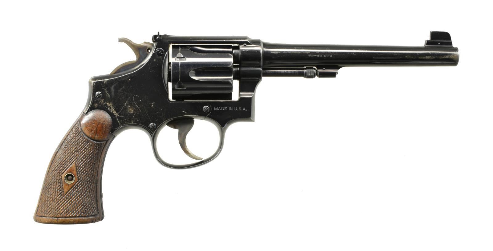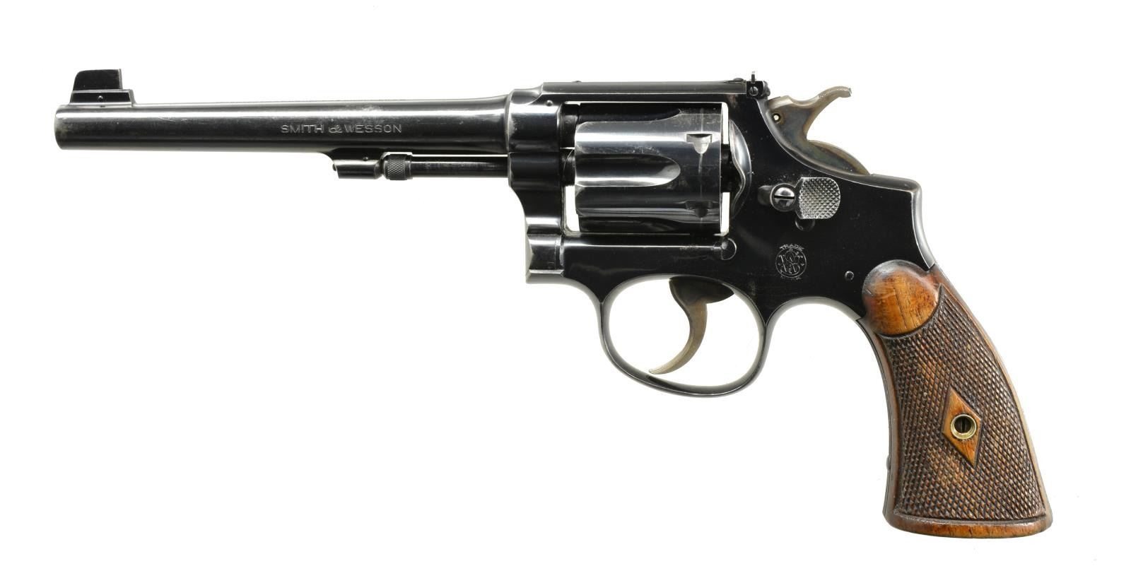 CHANGE DA REVOLVER. Cal. 32-20. S# 143552. Bbl. 6". Pinned blade front sight w/ square notch adj. rear sight. 6 Shot fluted cyl. 5 Screw action w/ pinned bbl. Blue finish w/ case colored hammer & trigger. 2 Piece checkered walnut grips. CONDITION: 80% blue w/ muzzle & edge wear showing a cyl. drag line & light scratches. Grips show wear & handling marks. Smooth mechanics. Bright bore retains sharp rifling. PROVENANCE: From the Frederic W. Thrane Collection. (20-2434/DS). CURIO. $700-1,000.