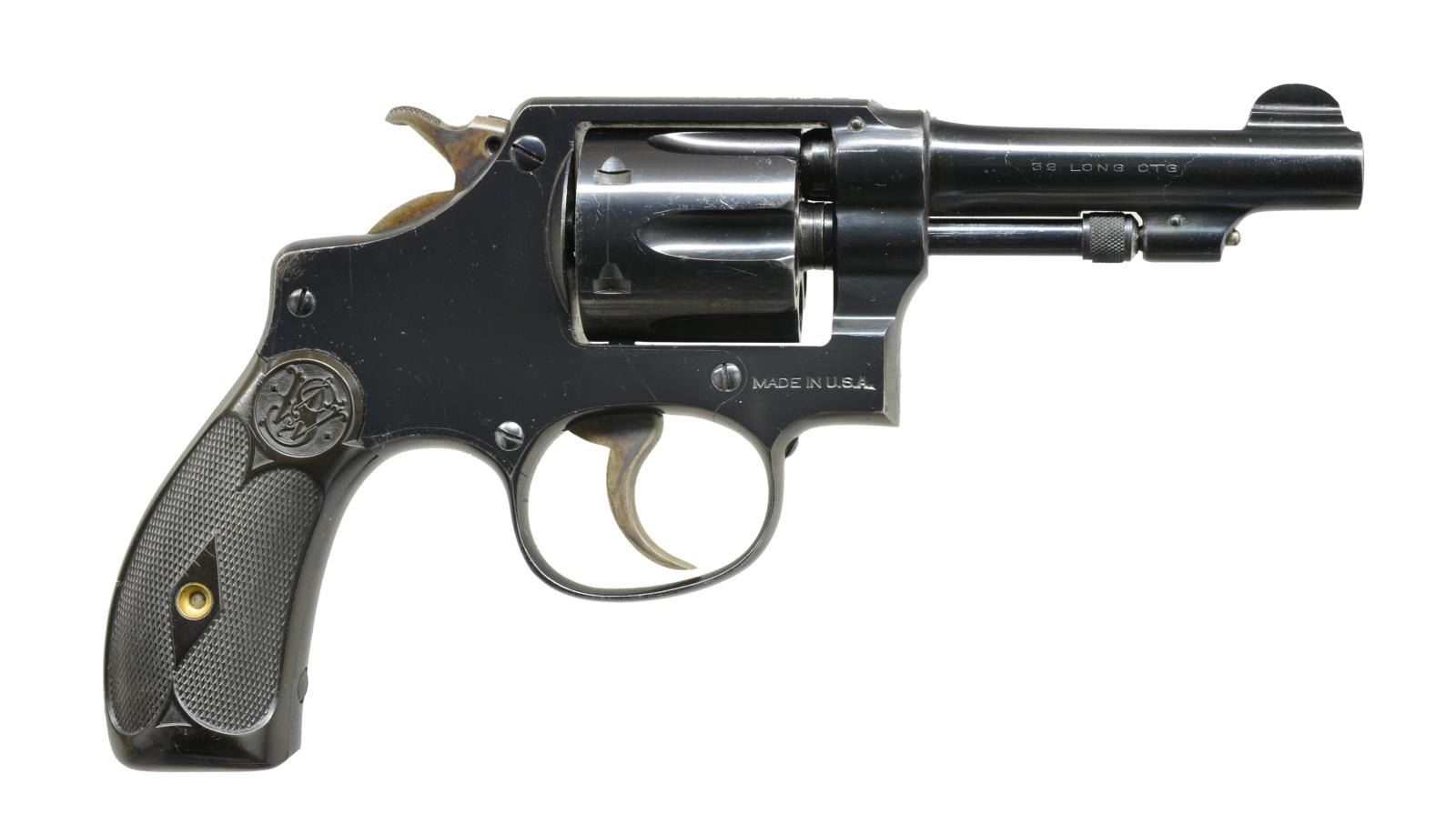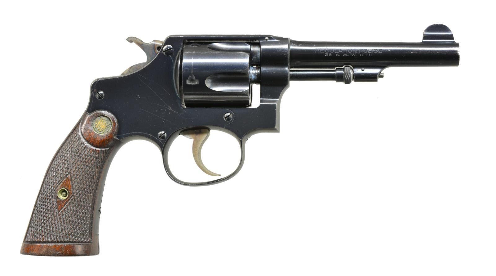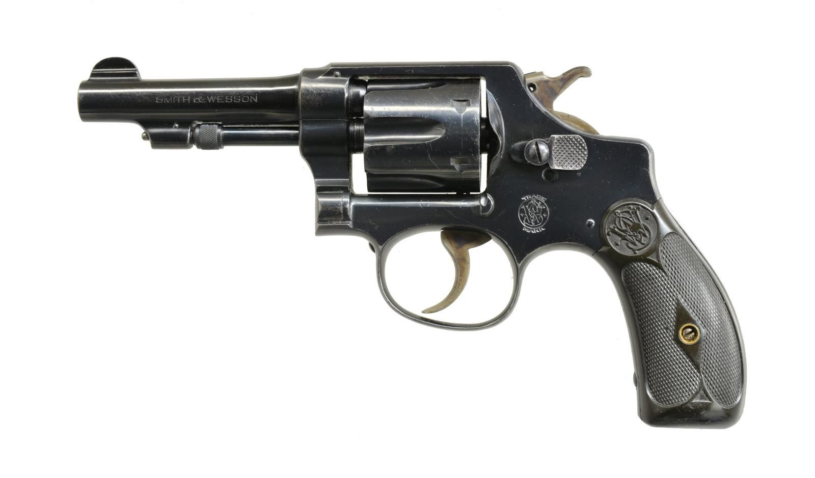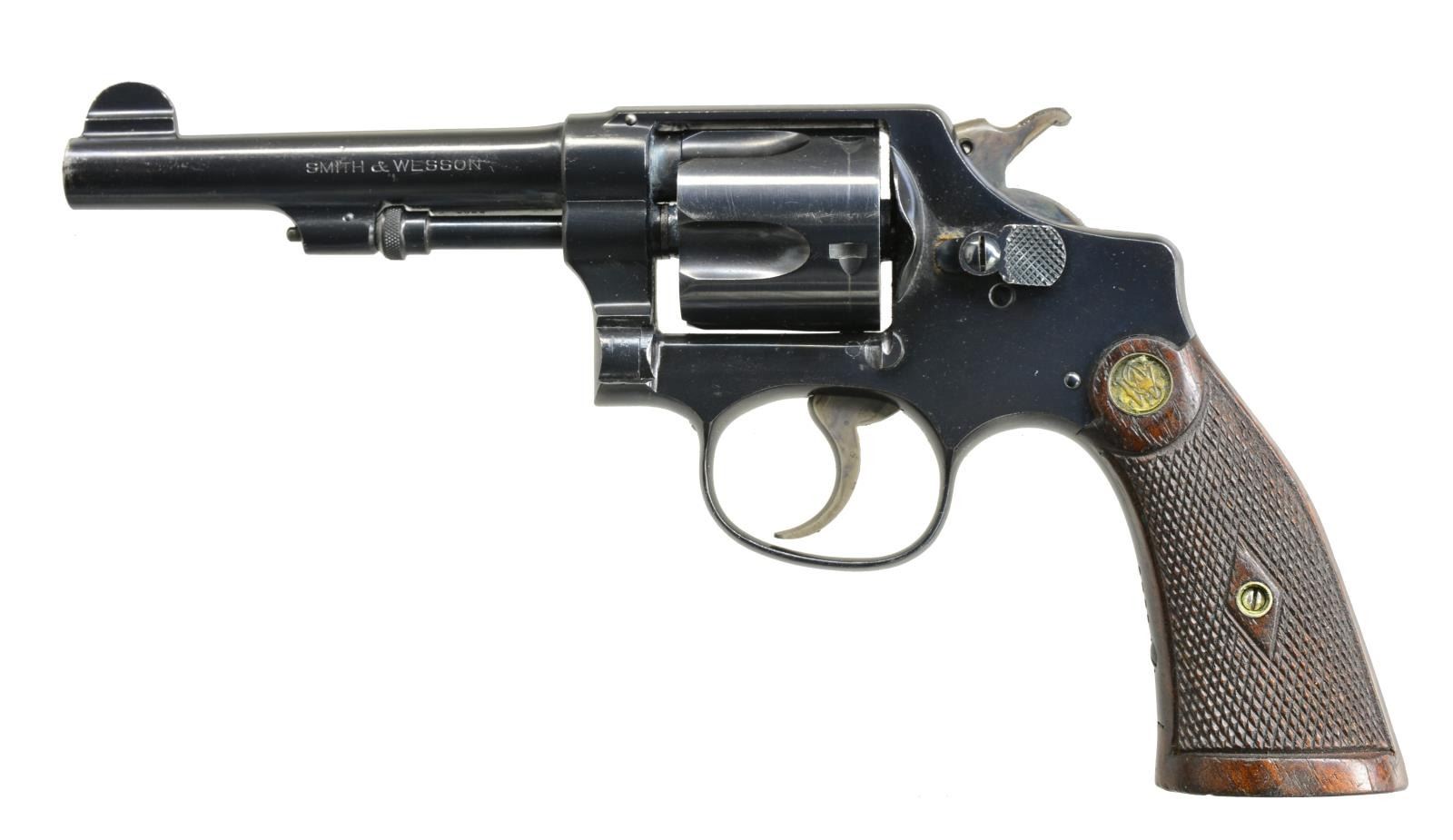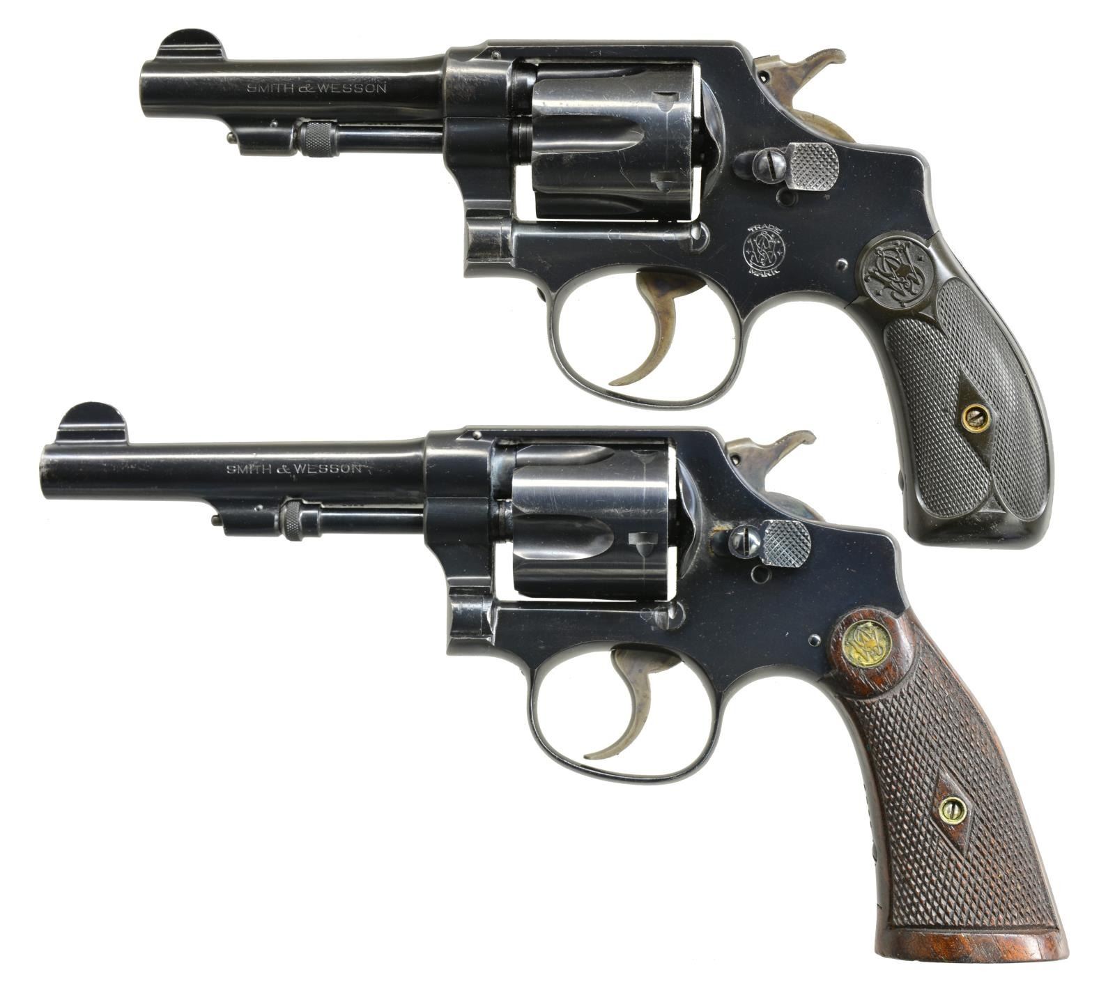 REGULATION POLICE DA REVOLVERS. ALL: blue finish w/ case colored hammers & triggers. 1) 3RD MODEL HAND EJECTOR. Cal. 32 S&W Long. S# 477953. Bbl. 3 1/4" rnd. w/ semicircular sight. 6 Shot fluted cyl. 2 Piece checkered hard rubber rnd. butt grips. CONDITION: 90% lightly worn original blue showing edge wear. Grips show light wear. Bright bore w/ strong rifling. (20-3774/DS). 2) REGULATION POLICE PRE WAR. Cal. 38 S&W. S# 8056. Bbl. 4" rnd. w/ semicircular sight. 5 Shot fluted cyl. 2 Piece checkered walnut grips w/ gold S&W medallions. Butt of left grip panel is stamped "PAT. JUNE 5, 1917". CONDITION: 85% lightly worn blue. Grips show moderate wear. Bore retains sound rifling showing a few sm. spots of pitting. (20-3777/DS). ALL CURIO. $650-1,000.