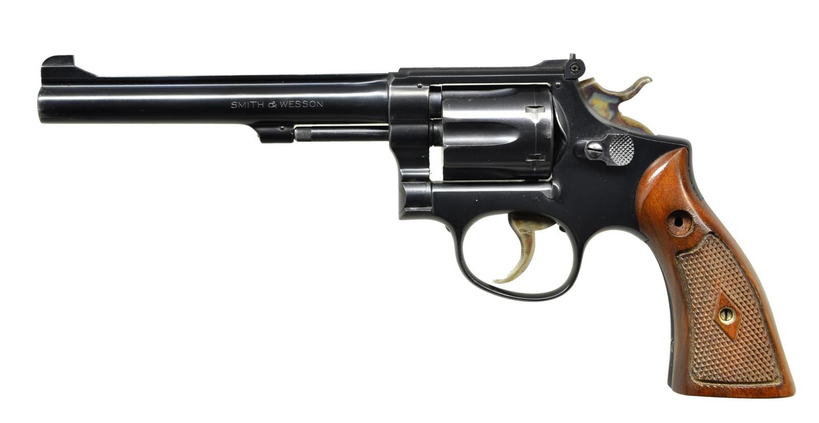 Cal. 22 LR. S# K135641. Bbl. 6". Micrometer rear sight & Patridge front sight. Blued finish w/ case colored hammer & trigger. Checkered Magna walnut grips. Right grip panel numbered matching to frame. Left panel is unnumbered & missing its medallion. CONDITION: grips show scattered light handling wear. Trigger & hammer retain most of their case colors w/ some operational wear & light oxidation. Blued surfaces retain 90% finish w/ a drag line on cyl, a few minor oxidation spots & some edge wear. Very good bore. (22-5816/MJC). CURIO. $700-1000.