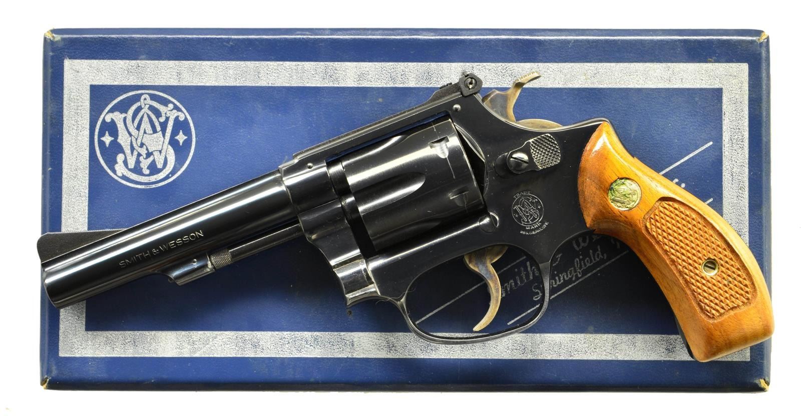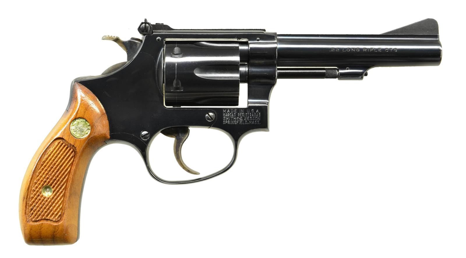 Cal.22 LR. S# M8817. Bbl. 4". Mfg.1969-1971. Traditional double action. 6-shot fluted cylinder. Smooth backstrap & frontstrap. Serrated black front ramp sight w/ adjustable rear. Serrated trigger. Checkered hammer spur & cylinder release. Walnut checkered grips w/ gold S&W medallion. UNATTACHED ACCESSORIES: Numbered blue, factory box, tools & paperwork. CONDITION: Blued finish enjoys full coverage w/ only a light drag line on cylinder. Grips illustrate no obvious impressions. Bright bore w/ strong rifling. (22-3589/JZ). CURIO. $400-600