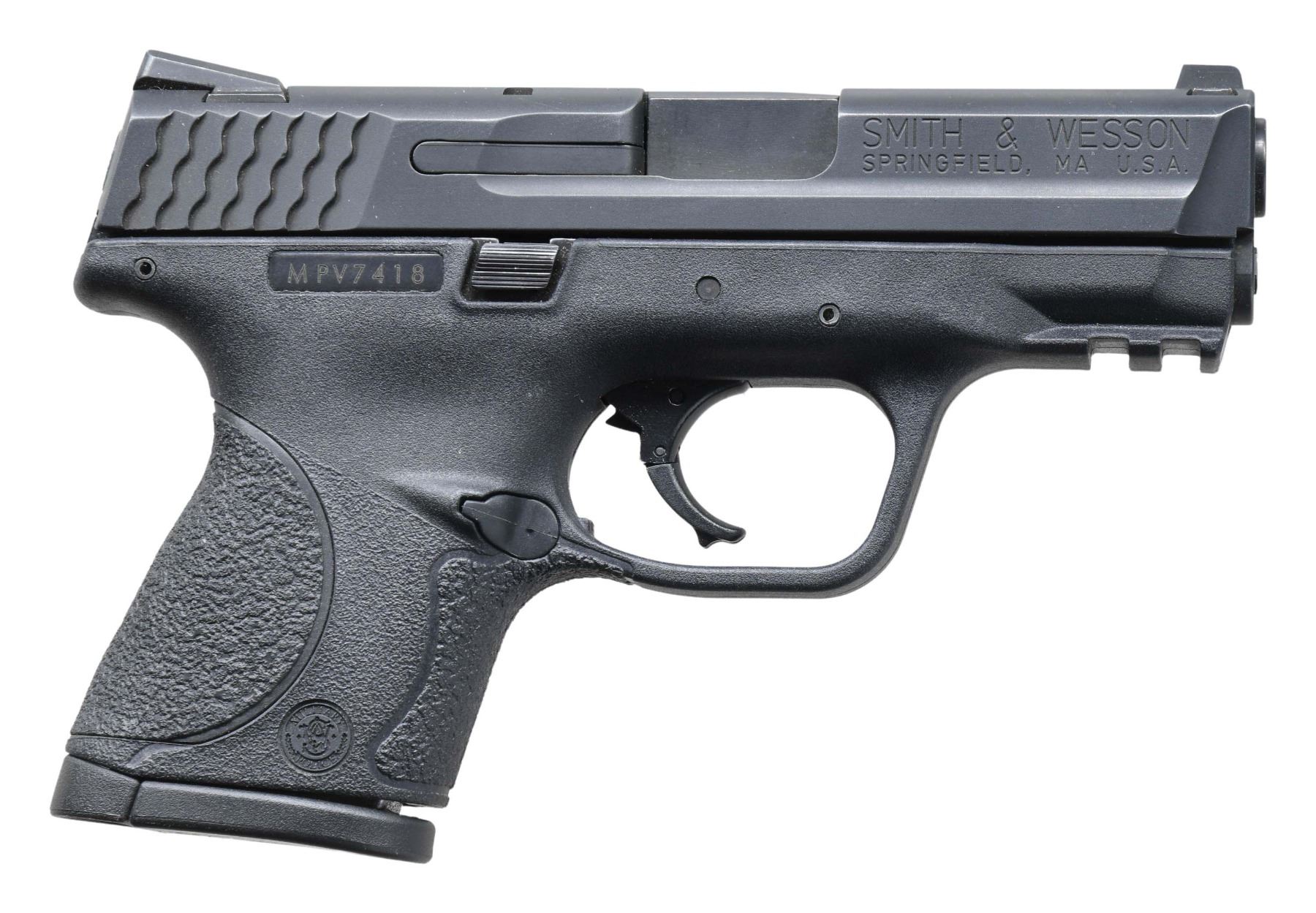 Cal. 40 S&W. S# MPV7418. Bbl. 3 1/2". Three dot sights. Matte black finish. Ambi slide release. Polymer frame with picatinny accessory rail. MAGS: 1-10 rd. UNATTACHED ACCESSORIES: right handed Uncle Mike's sidekick holster size 12. CONDITION: frame & metal show some handling & carry wear. Action functions properly when hand cycled. Bright near excellent bore. (25-4078/MJC). MODERN. $300-450.