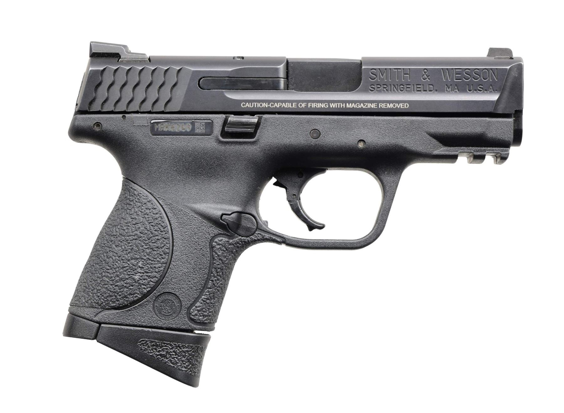 Cal. 40 S&W. S# HRK6249. Bbl. 3 1/2". Three dot sights. Matte black finish. Ambi slide release. Polymer frame with picatinny accessory rail. MAGS: two 10 rd. UNATTACHED ACCESSORIES: matching numbered factory hardcase with two grip straps, manual, and cable lock. CONDITION: grips and metal show some light edge & handling wear. Action functions properly when hand-cycled. Very good+, bright bore. PROVENANCE: the collection of Gun Sport Ltd., owned by Jon R. Thomas. (23-4575/MJC). MODERN. $200-400