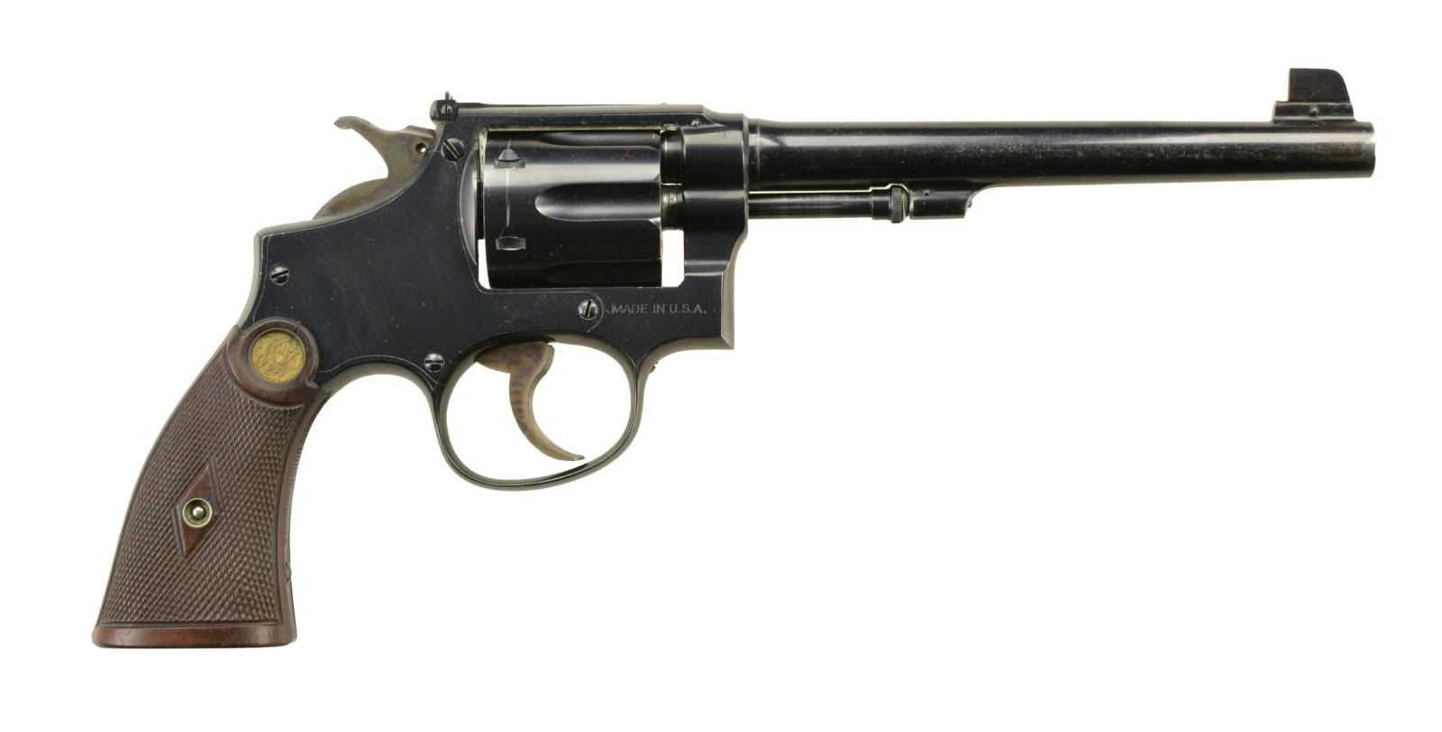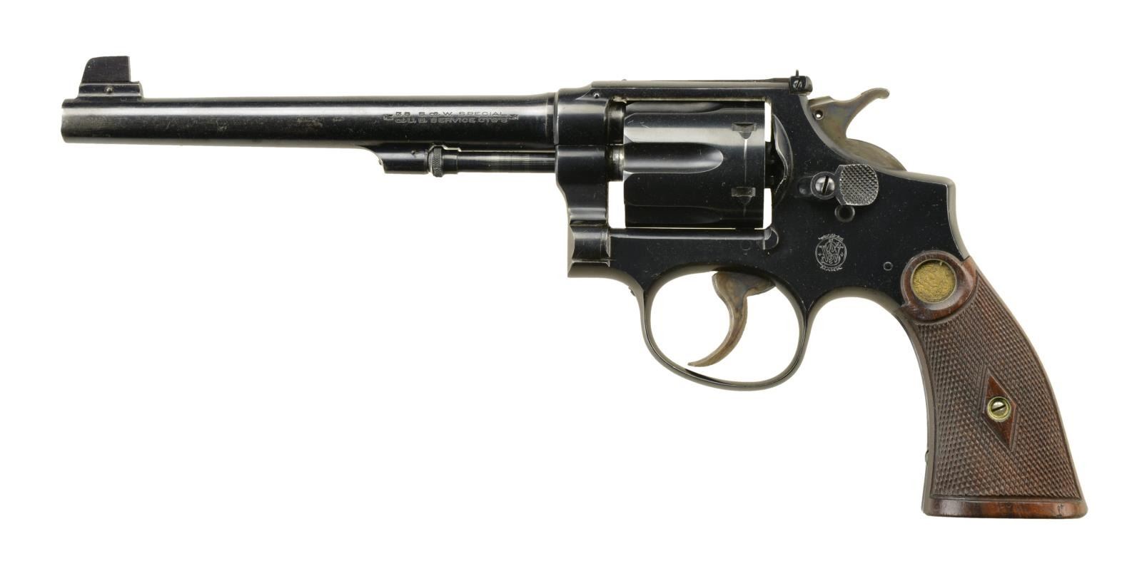 Cal. 38 S&W Special. S# 579190. Bbl. 6.5". 5 Screw, blued Military & Police traditional double action revolver. Round top bbl. strap. Blade front sight w/ windage adj. rear. 6 Shot fluted cyl. Serrated front & backstrap. Checkered hammer spur & cyl. release. Hardwood checkered grips w/ S&W medallions w/ single diamond over screw. CONDITION: blued finish displaying thinning, primarily on bbl. Thin drag line on cyl. Grips illustrate very light wear. Bright bore w/ well pronounced rifling. Timing appears fine in both single & double action. (22-3200/JZ). CURIO. $500-700.