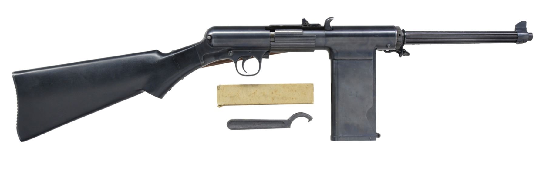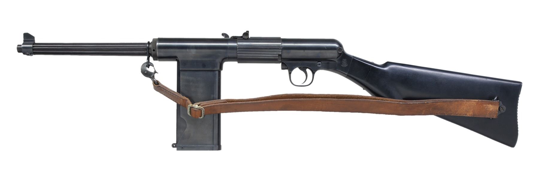 Cal. 9mm. S# 1564. Bbl. 10". Smith & Wesson began its journey in the light rifle business in 1939 when they were contacted by the British Gov't. searching for a light weight military carbine. A very short blowback operated open bolt system was chambered in 9mm Luger which was already common in the British arsenal & prototypes submitted for consideration. Without extensive testing the British Gov't. placed an order for the new model 1940 rifle, transferring $1,000,000.00 to Smith & Wesson. Shortly after receiving them, problems relating to the more powerful loaded British 9mm ammo started to arise & Smith & Wesson made some immediate design changes. They included the addition of a sleeve over the center of the receiver, both to add strength & dbl. as a safety by blocking the firing mechanism & redesignating the model as the MKII, retroactively designating the previous offering as the MKI. Great Britain cancelled the order a short while later & just over 1,000 total firearms were sold & shipped. At Smith & Wesson just over 200 receivers had been completed & placed into storage & where they sat until the mid 1970s when these rifles were classified by BATFE as Curios & Relics. Just under 150 MKI variants & just under 100 MKII variants were finished & sold in the United States sporting market. Bbl. is fluted & tapered w/ a non adj. front blade sight. Rear sight is adj. for windage plus elevation. Firing from an open bolt, the reciprocating cocking handle is on the right side at approx. 1 o"clock. Serrated band encompasses receiver behind rear sight acting as a safety when rotated counter clockwise. The unique mag. well loads from the top rear, first is brought downward into place where it is protected by a massive mag. well that dbls. as a bottom dumping ejection port. The stock measures 11 1/2" at its longest point & is capped w/ a metal buttplate serial number to match the rifle. Markings include "Smith & Wesson" trademark logo on rear left side of receiver & serial number on bottom of receiver just to the rear of the trigger guard. Thin leather sling, attached on factory swivel. UNATTACHED ACCESSORIES: 1 bbl. spanner wrench. MAGS: 2 steel factory 20 rd.; (often loaded w/ ease to 21 rds.). CONDITION: bluing is dark, deep & rich, consistent throughout the entirety of exposed metal surfaces, there are very few light handling marks & appears to have seen very little use, the stock exhibits a crack that encompasses the majority of the circumference but does not travel all the way around below the top receiver tang screw & possibly continues under the lower tang, the action moves freely & appears to function correctly when cycled by hand, good bore w/ strong rifling. (20-906/JZ). CURIO. $3,500-5,000.