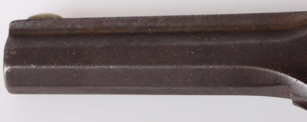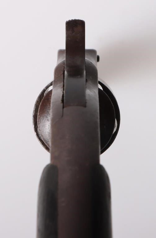 This revolver shows wear consistent with its age and retains no original bluing. The wood grips are original, intact, and not broken. Mechanically, the action is functional with a tight lockup and smooth sliding barrel. A great candidate for restoration or historical display.