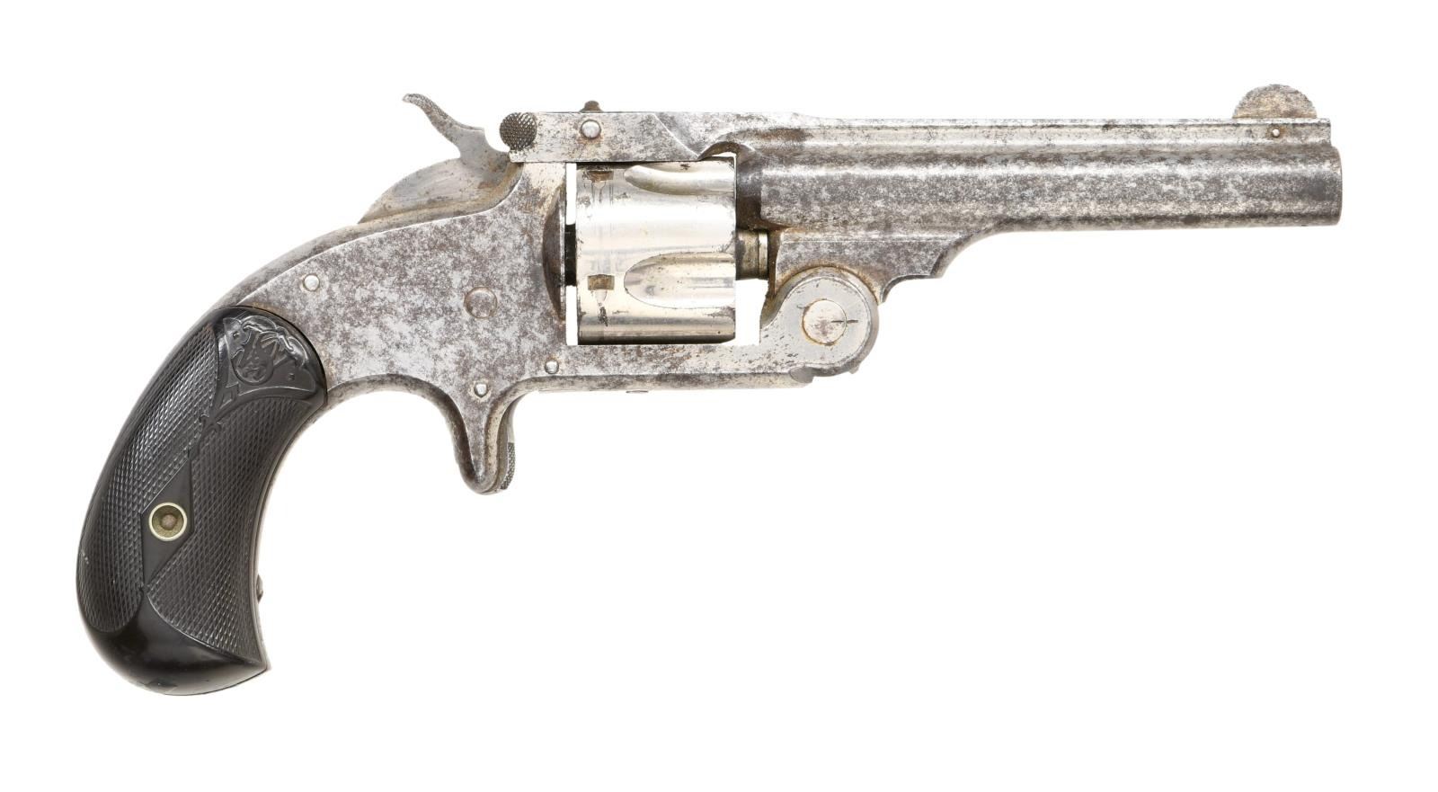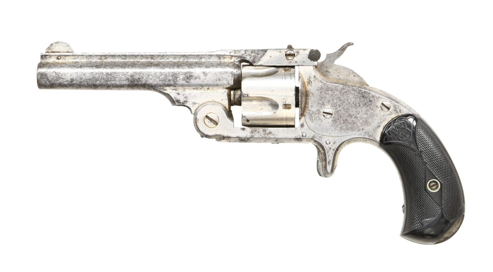 Cal. 32 S&W. S# 35372. Bbl. 3 1/2" bbl. Rounded blade front sight. Fixed rear sight. Last patent date is Dec. 18th, 1877. Nickel finish. Matching numbers on rear sight & cyl. Black checkered S&W grips. CONDITION: Left grip panel has a large chip missing at bottom, grips otherwise show scattered dings & handling marks. Metal shows oxidation throughout & some scattered pitting w/ cyl. retaining a high degree of nickel. Poor bore w/ pitting & oxidation but evident rifling. PROVENANCE: From the estate collection of Thomas J. Mulligan. (01-23826/MJC). ANTIQUE. $200-300.