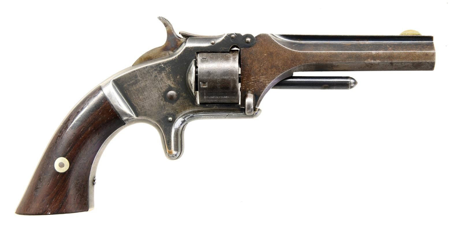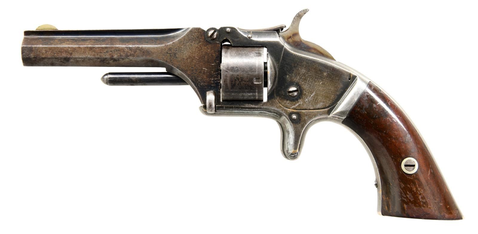 Cal. 22 Rimfire Short, black powder. S# 125241. Bbl.3.18" octagonal. Mfg. 1860-1868. Single action, tip up frame revolver, w/ blued barrel & cylinder and silver plated brass frame. 7 shot unfluted cylinder. Round blade front sight. Rear notch integrated into cylinder stop. Checkered hammer spur. Serial number on butt. Top of barrel marked "SMITH & WESSON SPRINGFIELD MA" on top. Cylinder marked w/ 3 patent dates: "April 3, 1855, July 5, 1859, Dec 18, 1860". Serial number range indicates 2nd issue, spanning from 11672-126361 w/ this example falling very late in the production range. It shares features w/ 3rd Issue, such as the 3 patent dates on the cylinder instead of the typical 2 dates, however the cylinder remains non fluted in the 2nd Issue and fluted in 3rd Issue. It also has the 2nd Issue octagonal barrel rather than the 3rd Issue round barrel. Dark brown hardwood grips. CONDITION: Finish remains consistent w/ light uniform thinning while retaining solid coverage. Grips remain free of any visible blemishing beyond original finish thinning in some spots, retaining their dark brown color. Timing appears correct. Clean bore w/ some darkening starting in grooves, retaining strong rifling. (01-23934/JZ). ANTIQUE.$200-400.