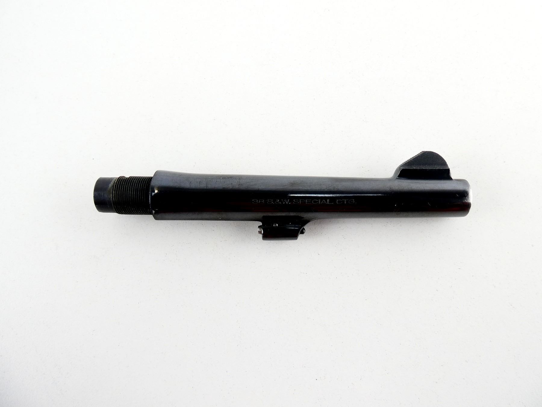 (1) .38 SPL BARREL, BORE IS EXCELLENT, BLUED STEEL CONSTRUCTION, MARKED: "SMITH & WESSON", "38 S&W SPL", ETC., WITH FRONT SIGHT, OVERALL LENGTH APPROX. 5". MAY REQUIRE FITTING. SEE PHOTOS. PAL REQUIRED.