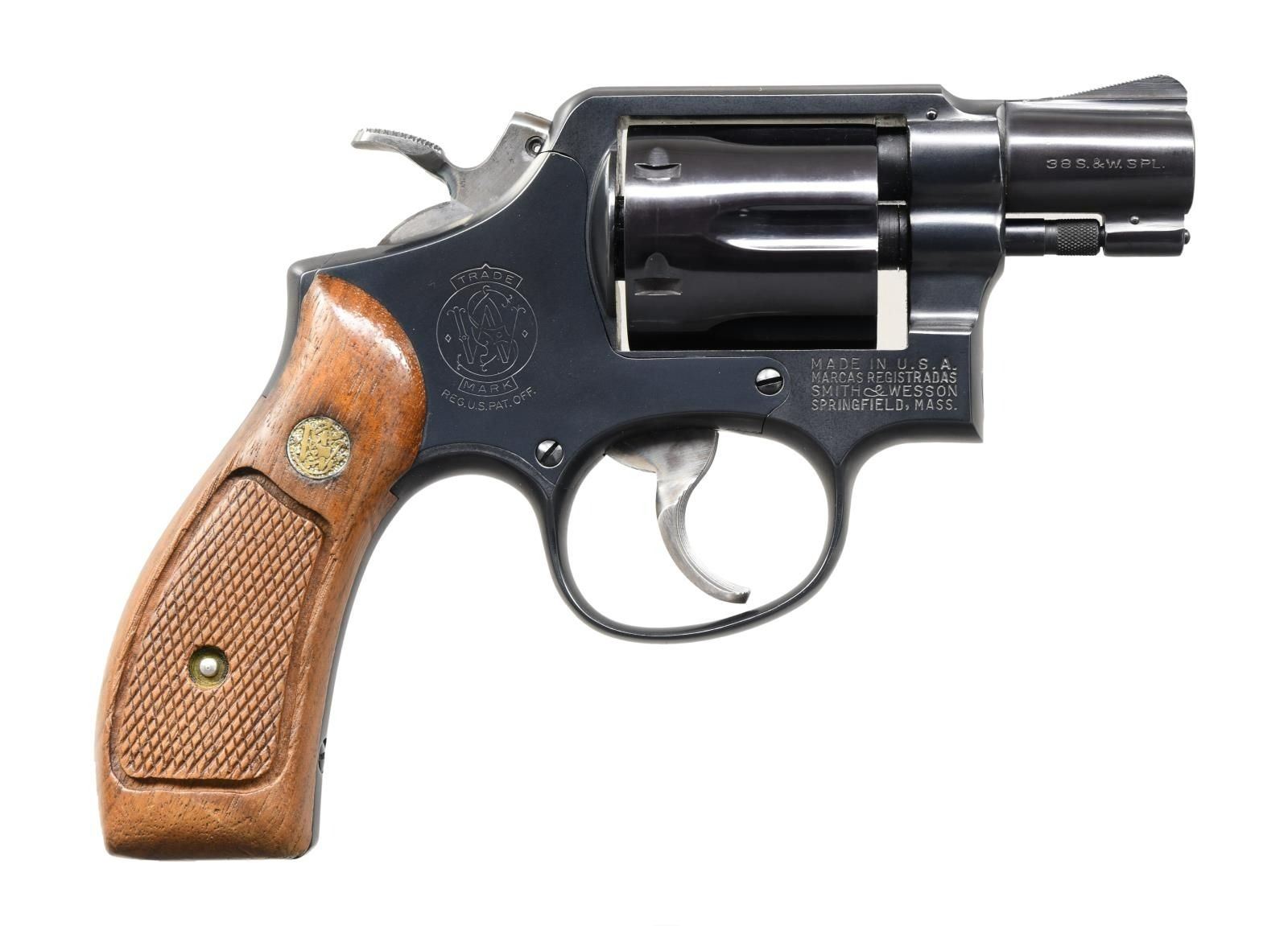 Cal. 38 Spl. S# D293395. Bbl. 2" pinned. Serrated ramped blade front sight. Fixed rear sight. Mfg. 1969-70. Blue finish w/ case colored target hammer & trigger. Checkered magna grips w/ S&W medallions. CONDITION: grips show a couple abrasions, some dings & handling marks. Hammer & trigger retain strong amounts of case colors w/ some fading, light oxidation & operational wear. Balance of metal retains 95% blue w/ some operational & edge wear. Very good bright bore. (23-5186/MJC). CURIO. $350-550.
