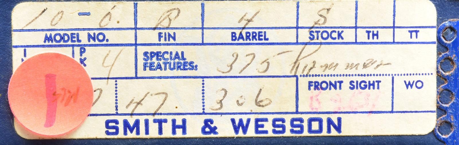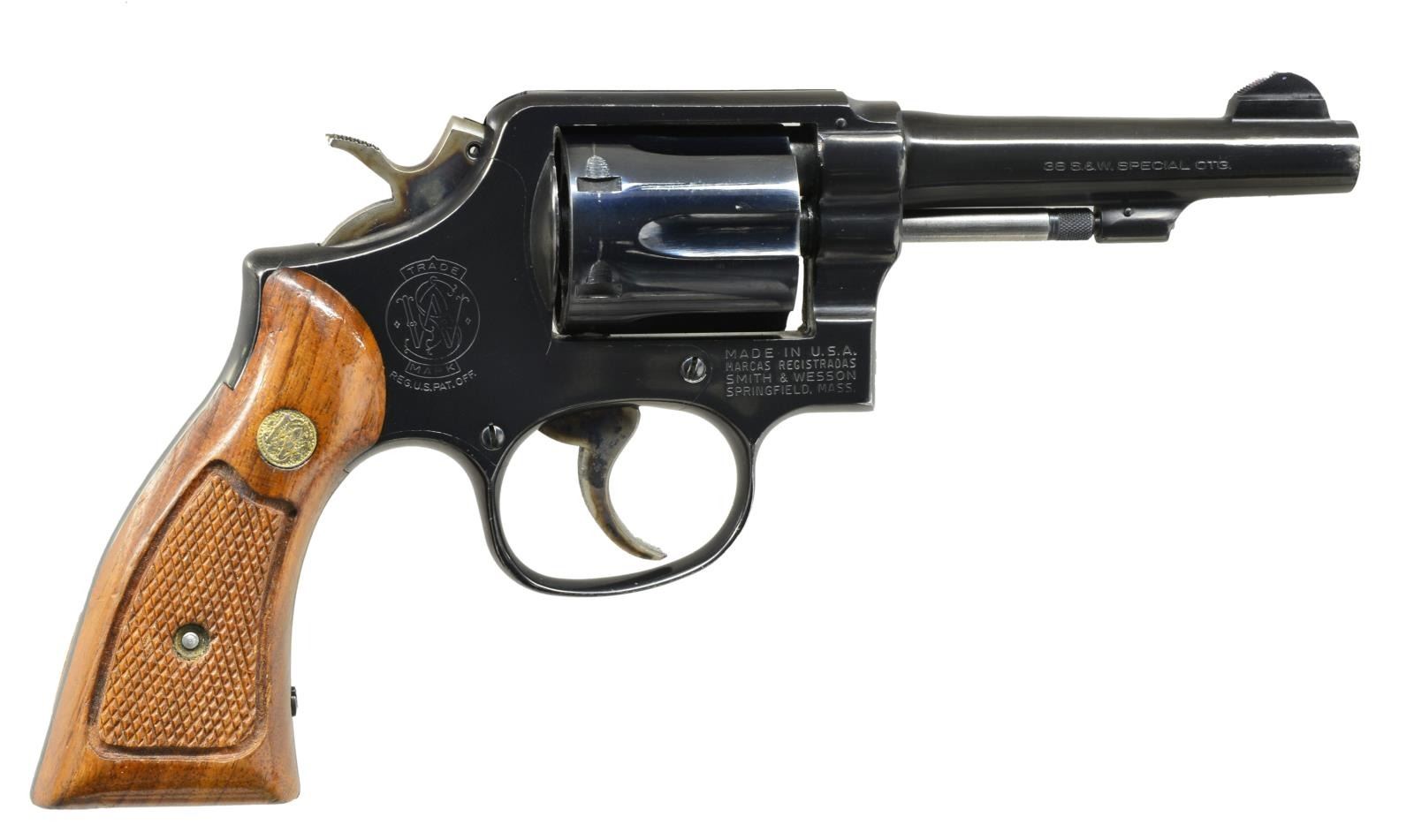 Cal. 38 Spl. S# 6D22213. Bbl. 4" rnd. w/ serrated ramp front sight. 6 Shot fluted cyl. 3 Screw action w/ pinned bbl. Blue finish w/ case colored hammer & trigger. 2 Piece checkered walnut Magna grips w/ S&W medallions. Mfg. 1980. UNATTACHED ACCESSORIES: 2 piece blue box w/ non matching label. CONDITION: 95% metal finish w/ cyl. drag line, light edge wear & fading finish on ejector rod. Grips have lightly worn finish w/ handling marks. Bright bore w/ sharp rifling. (21-930/DS). MODERN. $300-450.