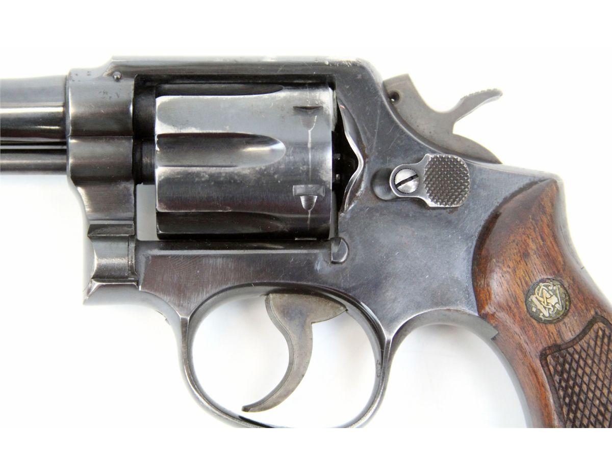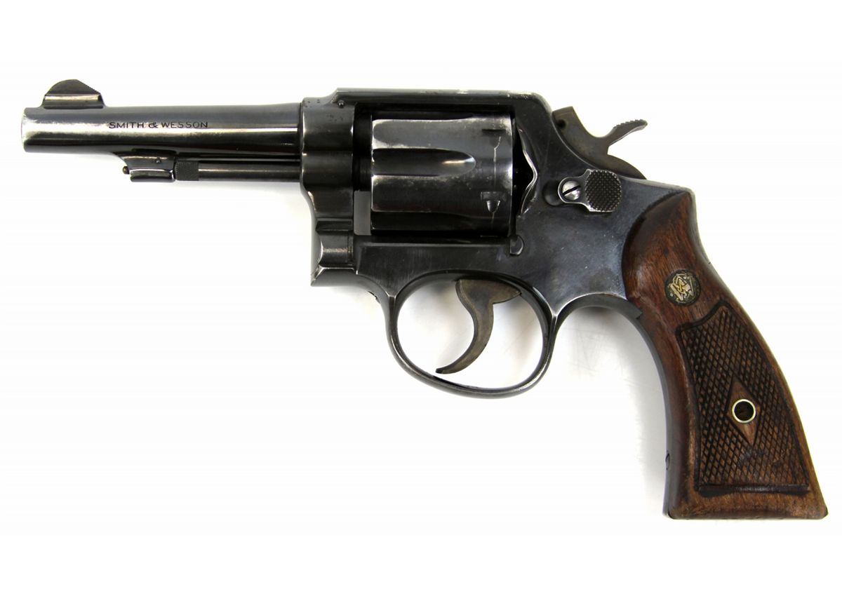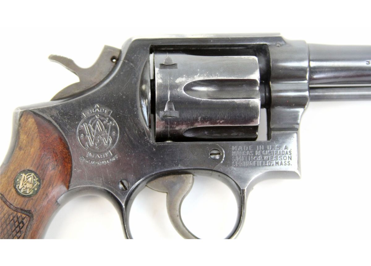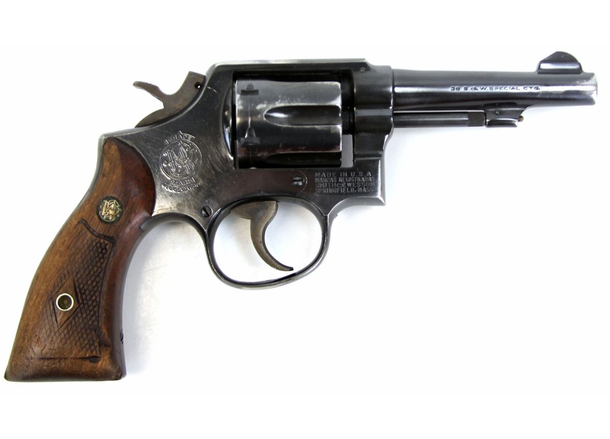 SMITH & WESSON MODEL 10 REVOLVER .38 SPL Smith & Wesson Model 10 revolver in .38 Spl. 4 inch barrel, ramp front sight, and original S&W medallion grips. Type: Revolver Manufacturer: Smith & Wesson Model: 10 Caliber / Gauge: .38 Spl Barrel Length: 4 inches Serial Number: C402425 Condition: Bore is bright and clean, bluing about 75%, with some holster wear. Grips show heavy handling wear, but no cracks.