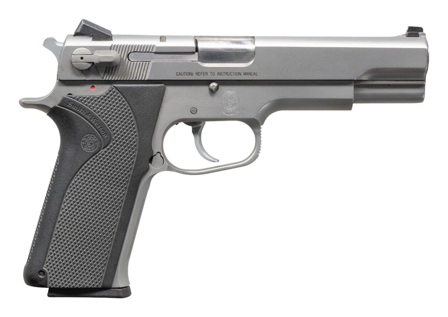 Cal. 10mm. S# TEV9252. Bbl. 5". Three dot sights. Ambi safety that also acts as a decocker. Right side of slide has "CAUTION: REFER TO INSTRUCTION MANUAL" marking. Stainless finish. Checkered black grips with S&W monograms. MAGS: 1-9 rd. CONDITION: grips show some handling marks. Metal shows some handling & operational wear. Mag does not engage slide lock back but action is otherwise functional when hand cycled. Bright near excellent bore. (25-4277/MJC). MODERN. $350-550.