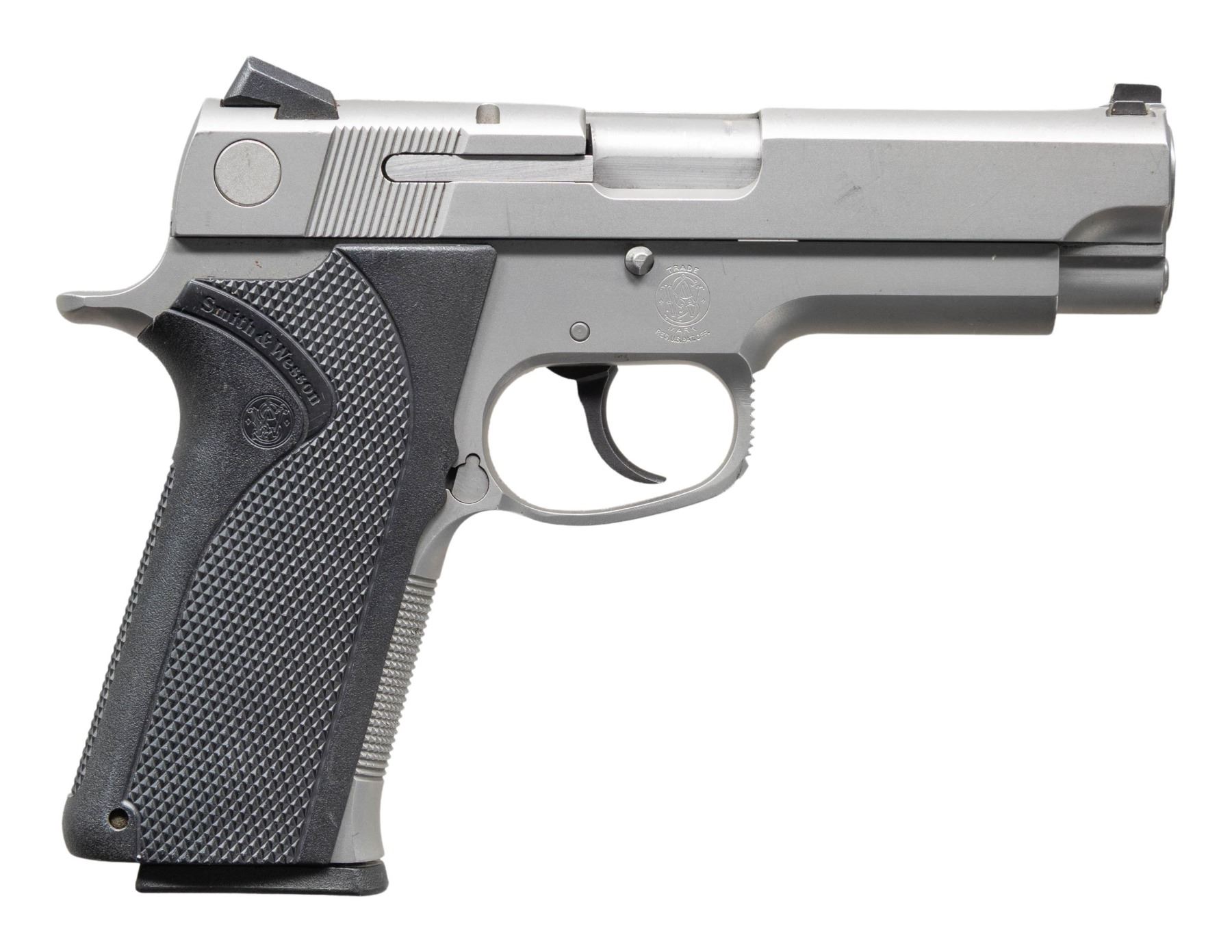 Cal. 10mm. S# VAD4426. Bbl. 4 1/4". Three dot sights. 1076 pistol with bobbed hammer & decocker. Pistol lacks mag disconnect safety. Stainless finish. Black checkered grips with S&W monograms. MAGS: 1-9 rd. CONDITION: grips show some handling marks. Metal shows scattered handling marks, some edge wear & scuffs. Action functions properly when hand cycled. Bright near excellent bore. (25-4276/MJC). MODERN. $350-550.