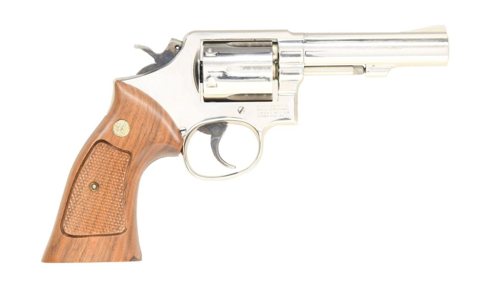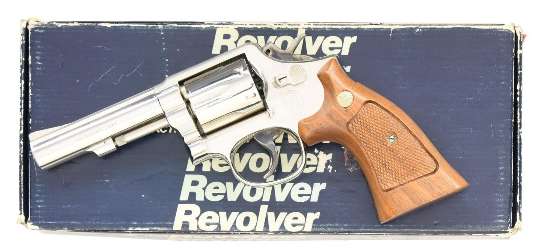 Cal. 357 Mag. S# ACF6608. Bbl. 4". Ramped serrated blade front sight. Fixed rear sight. Nickel finish w/ case colored trigger & hammer. Mfg. 1982-86. Checkered walnut grips w/ silver S&W medallions. UNATTACHED ACCESSORIES: unnumbered Bangor Punta S&W box. CONDITION: bottom front of grips show some dark staining. Grips otherwise show some light handling wear. Trigger & hammer retain much of their case colors w/ some operational wear. Balance of metal retains 97% original nickel w/ a moderate drag line on cyl & some light handling wear. Very good plus bright bore. (23-5213/MJC). MODERN. $800-1200.