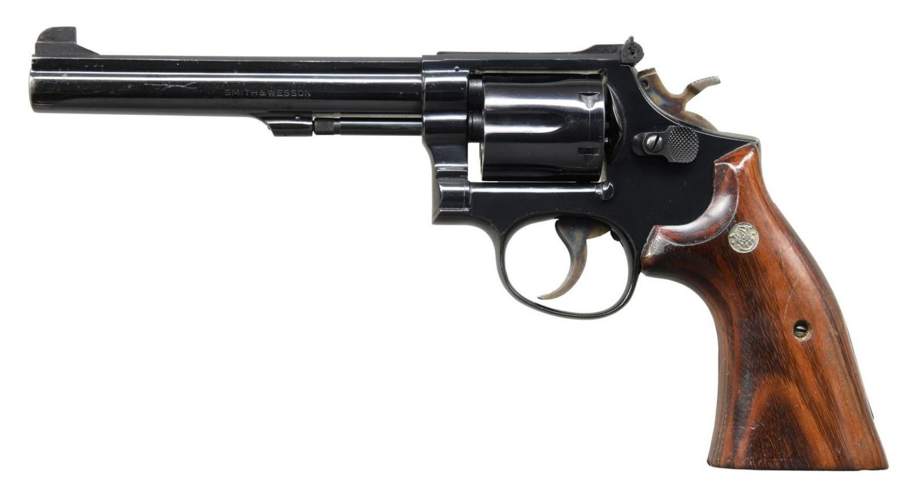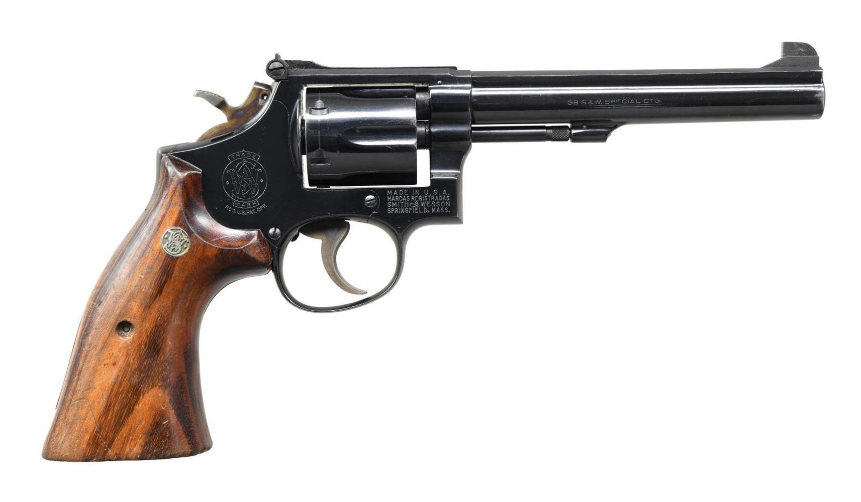Cal. 38 Spl. S# 1K18585. Bbl. 6" pinned. Patridge front sight. Adjustable rear sight. Mfg. 1970-71. Blued finish w/ case colored trigger & hammer. Smooth Goncalo alves target grips w/ silver S&W medallions. CONDITION: grips show added finish w/ scattered dings & handling wear. Hammer & trigger retain nearly all their case colors w/ some light oxidation & operational wear. Balance of metal retains 80% blue w/ scattered edge wear, operational wear, light scratches & fading to brown under bright light. Very good bright bore. PROVENANCE: The Collection of Gun Sport Ltd owned by Jon R. Thomas. (23-4036/MJC). CURIO. $400-600.