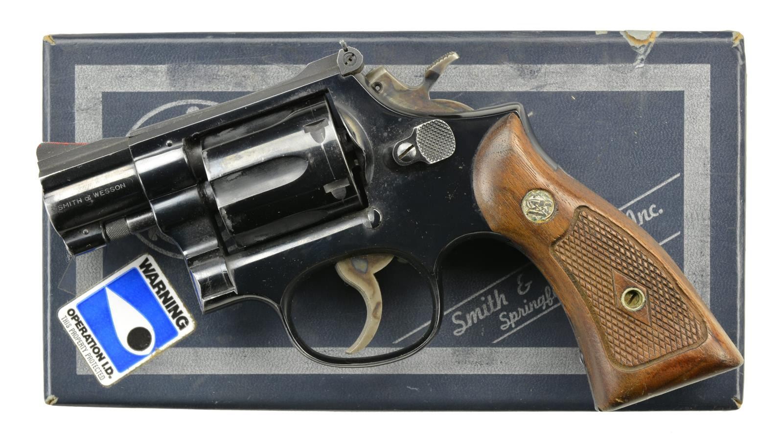 Cal. 38 S&W Special. S# K612748. Bbl. 2". Blued Model 15-2 traditional double action revolver; mfg. 1965. Serrated top bbl. strap. Black ramp front sight, painted red, w/ adj. rear. 6 Shot fluted cyl. Serrated front & backstrap. Serrated trigger. Checkered hammer spur & cyl. release. Hardwood checkered grips w/ S&W monogram & diamond over screw. UNATTACHED ACCESSORIES: numbered blue factory box, cleaning rod & paperwork. CONDITION: blued finish is complete & consistent w/ some thinning on some high areas, at muzzle & on cyl. Grips illustrate checkering wear & scattered impressions. Bright bore w/ well pronounced rifling. Timing appears fine in both single & double action. (22-3187/JZ). CURIO. $300-500.