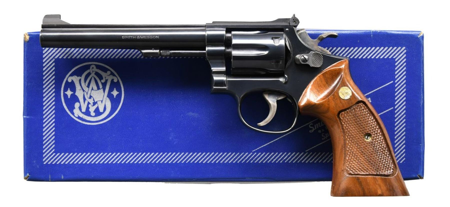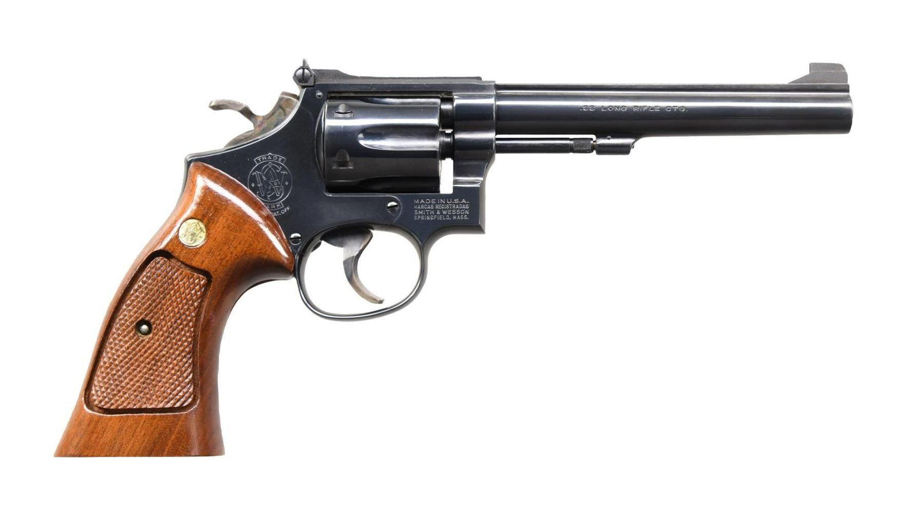 Cal. 22 LR. S# 99K2775. Bbl. 6". Patridge front sight. Adjustable rear sight. Blue finish w/ case colored trigger & hammer. Checkered target grips w/ silver S&W medallions. UNATTACHED ACCESSORIES: matching numbered two-piece factory box w/ manual, paperwork, screwdriver & cleaning rod w/ two brushes. CONDITION: rear top of left grip panel shows a minor chip, grips otherwise show light handling wear. Trigger & hammer retain most of their case colors w/ some operational wear. Balance of metal retains 97% original blue w/ some light edge & operational wear. Bright near excellent bore. (23-5258/MJC). MODERN. $500-800.