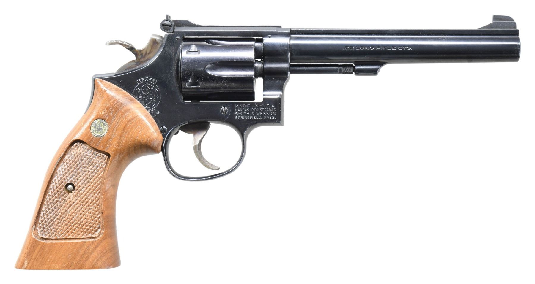 Cal. 22 LR. S# 21K3623. Bbl. 6" pinned. Patridge front sight. Adjustable square notch rear sight with white outline. 1977 made S&W 17-4 revolver. 6-shot recessed cyl. Blued finish with case colored target hammer & trigger. Checkered walnut target grips with silver S&W medallions. CONDITION: grips show white staining, flaking finish & handling marks. Hammer & trigger retain most of their case colors with some operational & edge wear. Balance of metal retains 97% original blue with some oxidation under grips,handling marks & operational wear. Action functions properly when hand cycled. Bright near excellent bore. (25-3659/MJC). MODERN. $400-600.