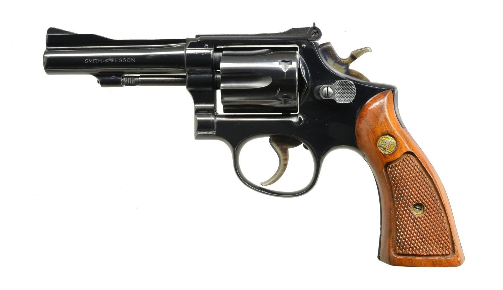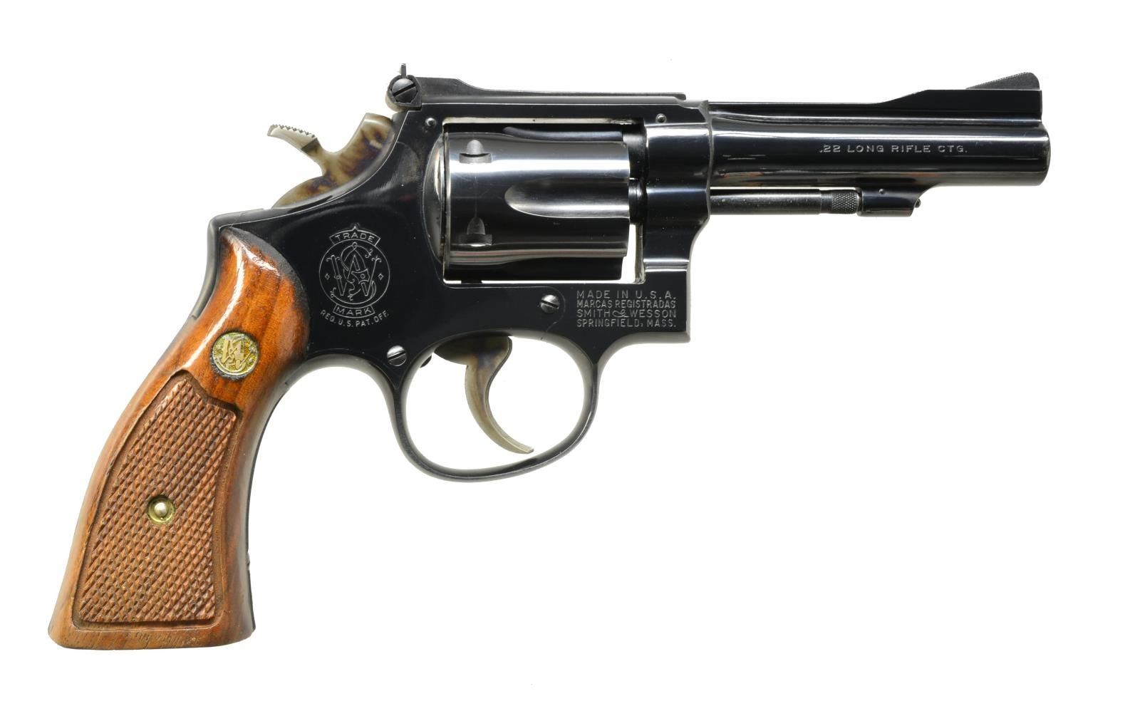 Cal. 22 LR. S# K642181. Bbl. 4" w/ rim. Integral ramp front sight. Adj. rear sight. Standard checkered S&W grips. Standard trigger & hammer. 6 Shot cyl. CONDITION: original blue w/ minor wear. Grips have original finish w/ good checkering & minor handling marks. Bore is shiny. Gun is in time. (20-3042/BT). CURIO. $700-1,000.