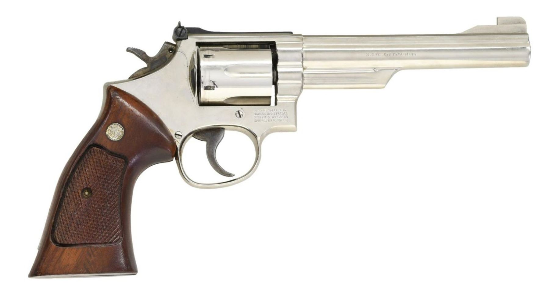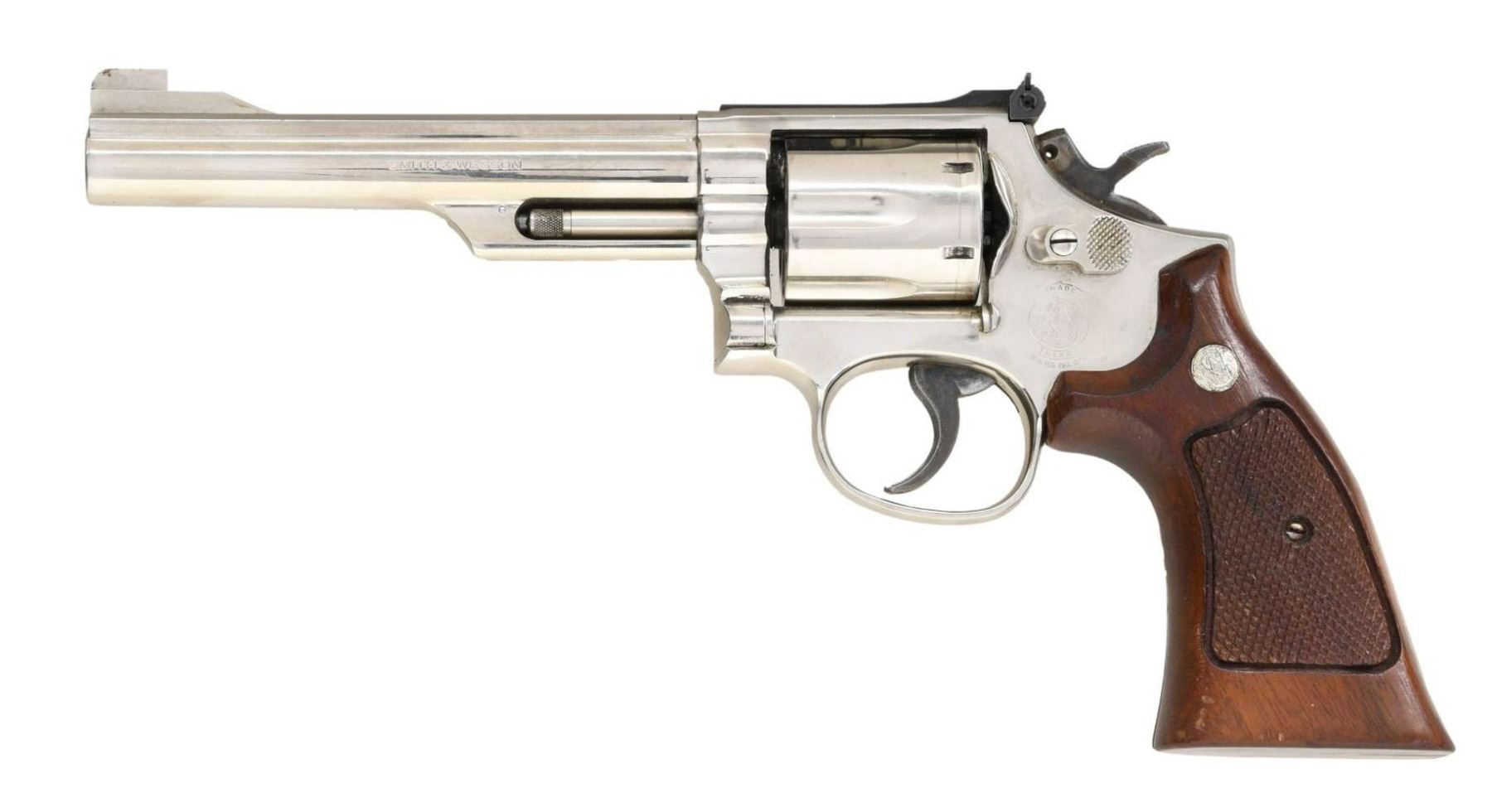 Cal. 357 Mag. S# ACD6228. Bbl. 6". Patridge front sight. Adjustable rear sight. Mfg. 1983. Nickel finish w/ case colored trigger & hammer. Checkered walnut target grips w/ silver S&W medallions. CONDITION: grips show a couple small chips, some dings & handling marks. Trigger & hammer retain most of their case colors w/ some operational wear & oxidation. Balance of metal shows some oxidation on grip frame mostly under grips, a drag line on cyl., some scattered light scratches & handling marks. Very good bore. (23-5311/MJC). MODERN. $700-1000.