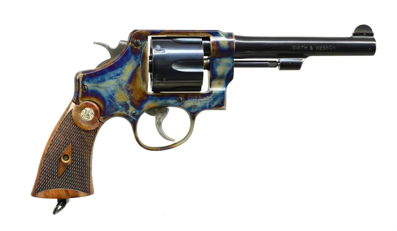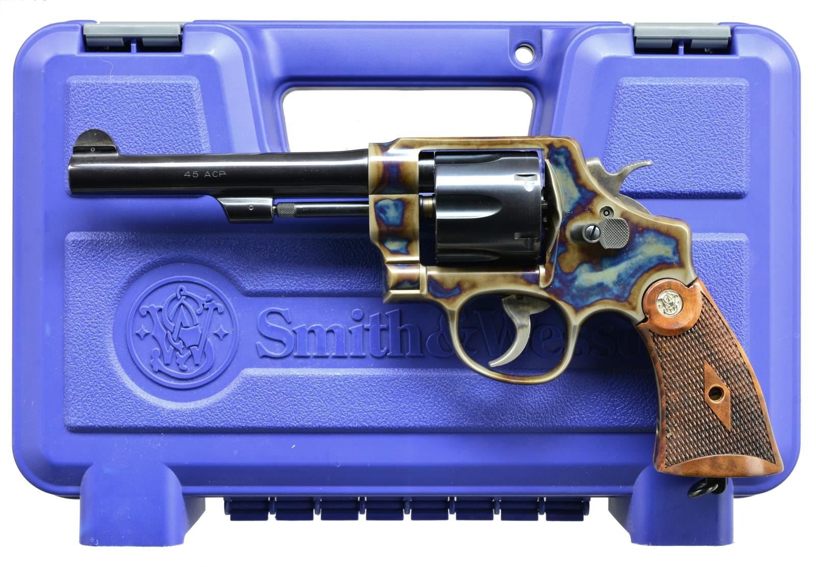 Cal. 45 ACP. S# DBA0898. Bbl. 5 1/2" w/ semi circular sight. 6 Shot fluted swing out cyl. Case colored frame w/ lanyard loop at butt. 2 Piece diamond checkered walnut grips w/ S&W medallions. UNATTACHED ACCESSORIES: blue molded box w/ matching label containing instruction manual, registration card, 5 full moon clips, trigger lock, keys for hammer lock safety & fired casing. CONDITION: near new retaining over 99% finish showing faint cyl. drag line. Bright near excellent bore. (21-1200/DS). MODERN. $600-900.