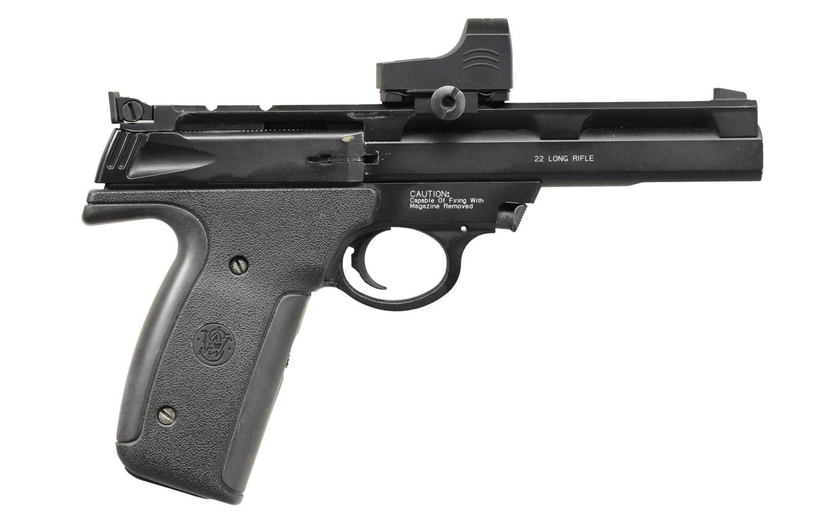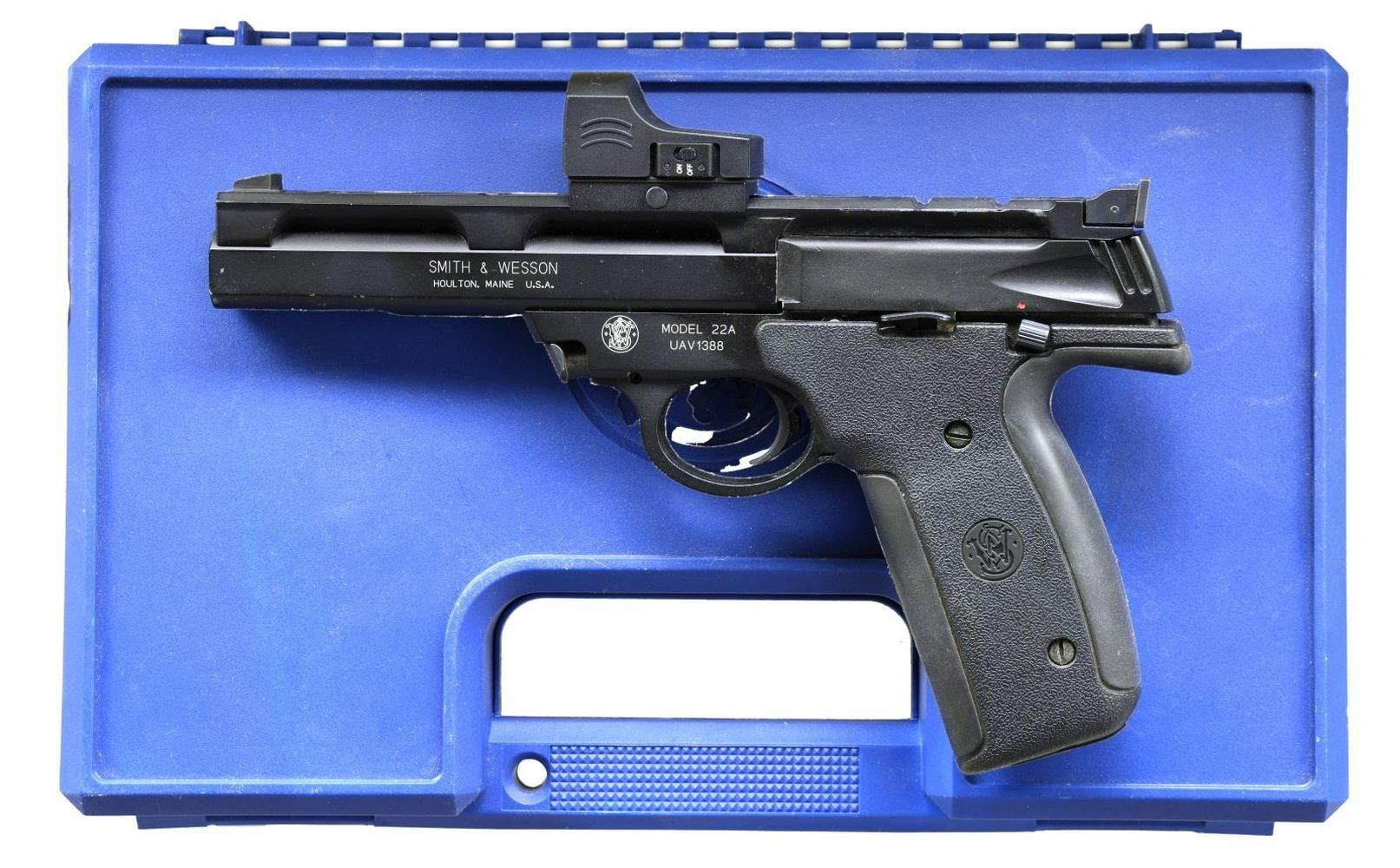 Cal. 22LR. S# UAV1388. Bbl. 5.5". Target pistol from S&W, manufactured in Houlton, ME. Aluminum alloy frame w/ stainless steel slide. Matte black finish. Blade front w/ fully adjustable rear sights. Left side extended slide release. Ambidextrous mag release located in front of pistol grip. Left side thumb safety. 8" Weaver style base on top of slide for optic mounting, currently sporting Burris FastFire 2, red-dot sight. Soft touch, 2-piece grips. MAGS: 3 factory 10rd. UNATTACHED ACCESSORIES: Blue plastic factory case, lock. CONDITION: Finish complete & consistent w/ some thinning, primarily on high spots & in areas of mechanical intervention. Bright bore w/ strong rifling. (23-6051/JZ). MODERN. $300-400.