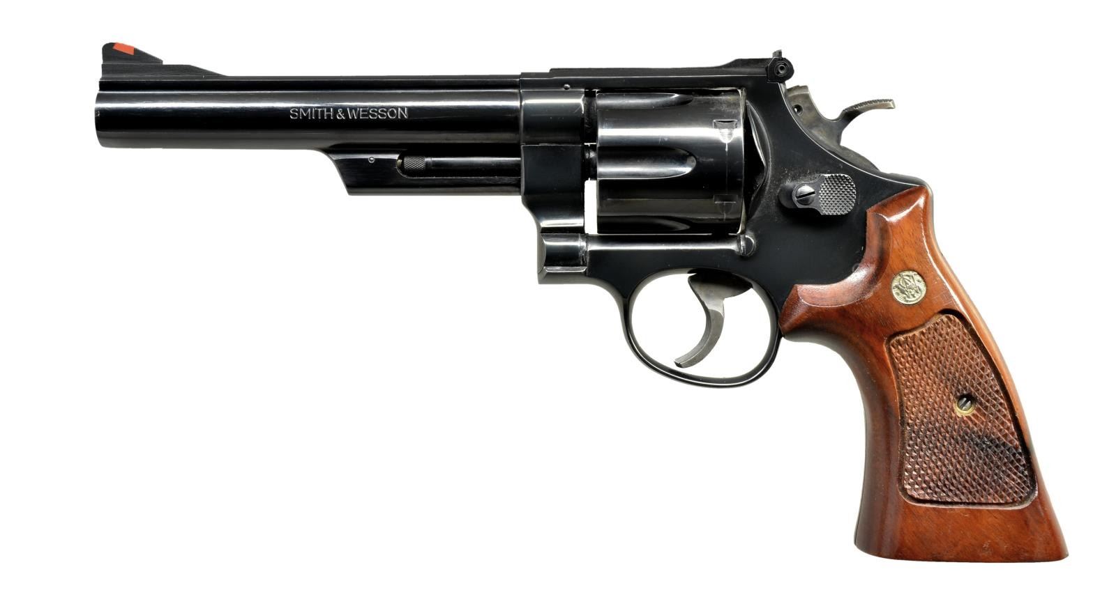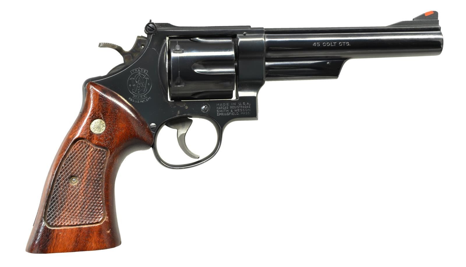 Cal. 45 LC. S# N827804. Bbl. 6" pinned w/ Baughman red insert front sight & white outline Micrometer rear. Mfg. 1980-1983 w/ case colored target trigger & hammer. Checkered Goncalo Alves target grips w/ speed loader cutout. UNATTACHED ACCESSORIES: unlabeled & unmarked S&W style blue box w/ packaging to include manual, cleaning kit, screwdriver & 2 HKS speed loaders. CONDITION: very good general original appearance w/ spots of finish loss as if by chemicals on right side above trigger & thumbprint sized spot on cyl. (also lightly pitted) plus light cyl. turn line. Very light firing residue. Very good plus grips w/ some very faint marks. Near excellent bore & chambers. (21-4221/NW). MODERN. $800-1,200.
