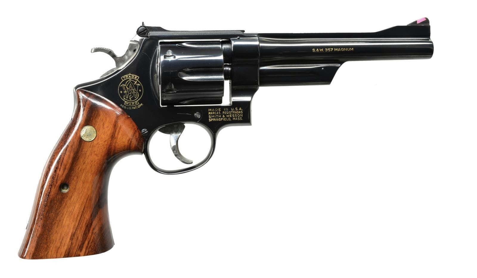 Cal. 357 Mag. S# N339880. Bbl. 6" w/ rib & shrouded ejector. Red serrated ramp front sight & white outline square notch rear sight. 6 Shot fluted cyl. N Frame 3 screw action w/ pinned bbl. & checkered top strap. Target hammer & target trigger have added machine jeweled finish on sides. Bbl. & action markings have added Bonanza gold fill. Smooth Goncalo Alves target grips w/ S&W medallions. Mfg. 1975-1977. UNATTACHED ACCESSORIES: presentation box containing, cleaning kit, instruction manual, ammo pamphlet, registration card, safety card, & pamphlets for S&W knives & holsters. CONDITION: 98% blue showing cyl. drag line & sm. scratches. Very good grips. Bright near excellent bore. (21-1152/DS). MODERN. $800-1,200.