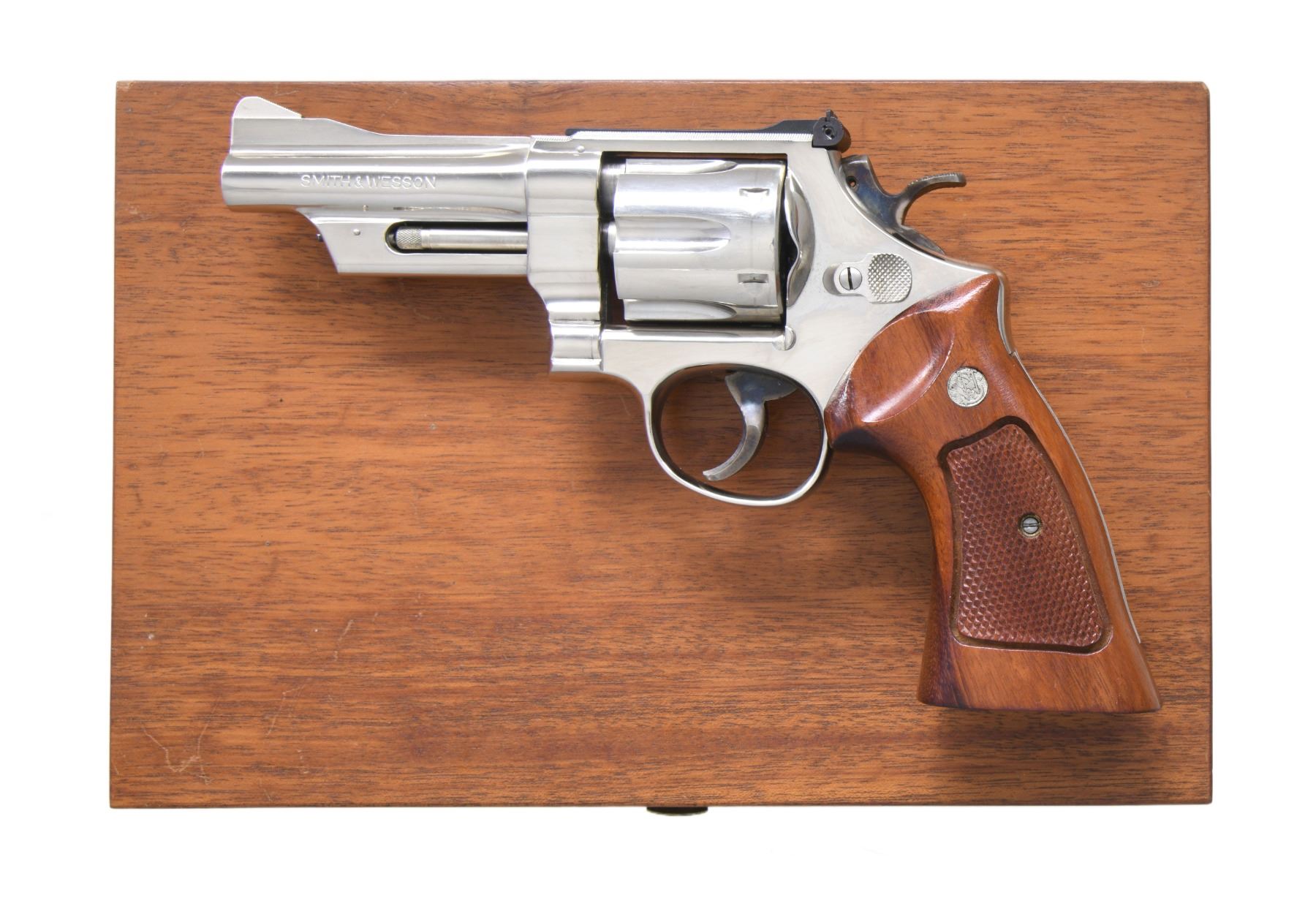 Cal. 357 Mag. S# N674600. Bbl. 4" pinned. Ramped serrated blade front sight. Adjustable square notch rear sight. 1979-1980 made S&W 27-2 revolver. Nickel finish with case colored target trigger & hammer. Checkered walnut grips with silver S&W medallions. UNATTACHED ACCESSORIES: hardware display case with paperwork. CONDITION: all aspects near excellent including bore. Consignor states gun has not been fired since leaving factory. PROVENANCE: From the Lifelong Collection of George Staden S&W Member #3451. (25-113/MJC). MODERN. $1000-1500.