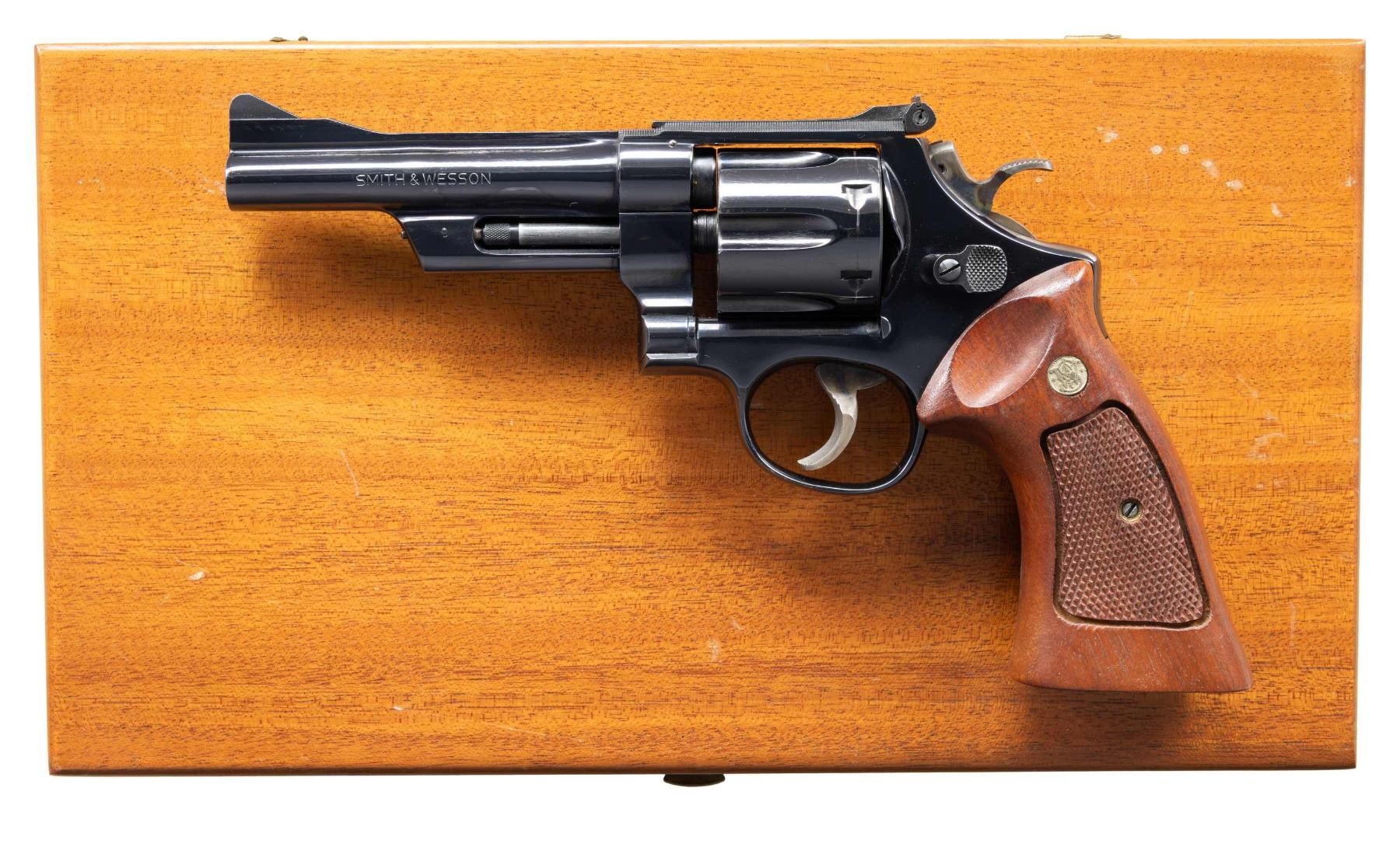 Cal. 357 Mag. S# N341241. Bbl. 5" pinned. Ramped serrated blade front sight with some added red paint. Adjustable square notch rear sight. 1975-1976 made 27-2 revolver. Recessed 6-shot cyl. Blued finish with case colored target hammer & trigger. Checkered walnut target grips with silver S&W medallions. UNATTACHED ACCESSORIES: correct factory presentation case that shows interior deterioration with screwdriver, cleaning kit, manual & paperwork. CONDITION: grips show some staining, flaking finish & handling marks. Trigger & hammer retain most of their case colors with some fading, operational wear & oxidation specks. Balance of metal retains 97% original blue with an uneven area on both sides of bbl. where bulge is, some handling marks, operational & edge wear. Action functions properly when hand cycled. Bore shows a large bulge about halfway down, that no doubt prevents safe firing of this revolver. (25-4697/MJC). MODERN. $400-600.