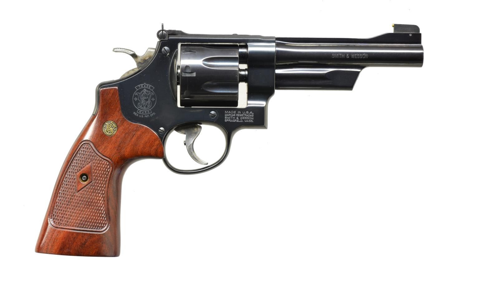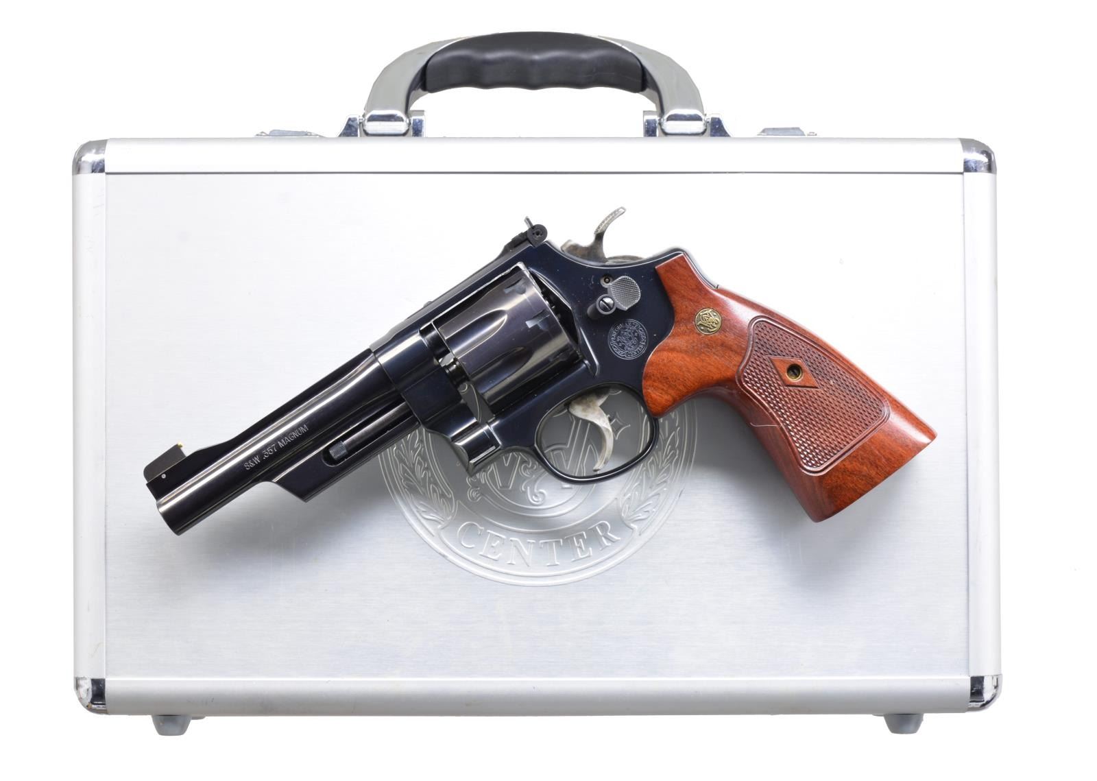 REVOLVER. Cal. 357 Mag. S# RTD0055. Bbl. 5" w/ rib & fully shrouded ejector. Ramp mounted McGivern brass bead front sight & white outline square notch adj. rear sight. 6 Shot fluted cyl. 3 Screw N frame action w/ Case colored target hammer & trigger. Blue finish. Custom 2 piece diamond checkered target grips w/ S&W medallions. UNATTACHED ACCESSORIES: S&W marked foam lined aluminum case. CONDITION: over 98% original finish showing a slight cyl. drag line. Bright near excellent bore. (20-3276/DS). MODERN. $1,000-1,500.