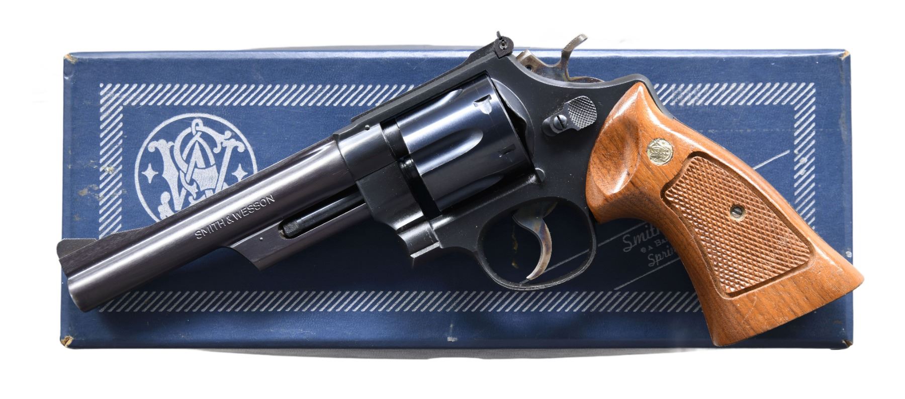 REVOLVER. Cal. 357 Mag. S# N585773. Bbl. 6" pinned. Ramped serrated blade front sight. Adjustable square notch rear sight. 28-2 Highway Patrolman revolver made 1978-1980. Blued finish with case colored hammer & trigger. Checkered walnut grips with silver S&W medallions. UNATTACHED ACCESSORIES: correct factory box that has been renumbered to match with paperwork. CONDITION: grips show light handling wear. Trigger & hammer retain strong amounts of case colors with some fading & operational wear. Balance of metal retains 98% original blue with some light edge wear. Action functions properly when hand cycled. Action functions properly when hand cycled. Bright near excellent bore. PROVENANCE: From the Lifelong Collection of George Staden S&W Member #3451. (25-118/MJC). MODERN. $700-1100.